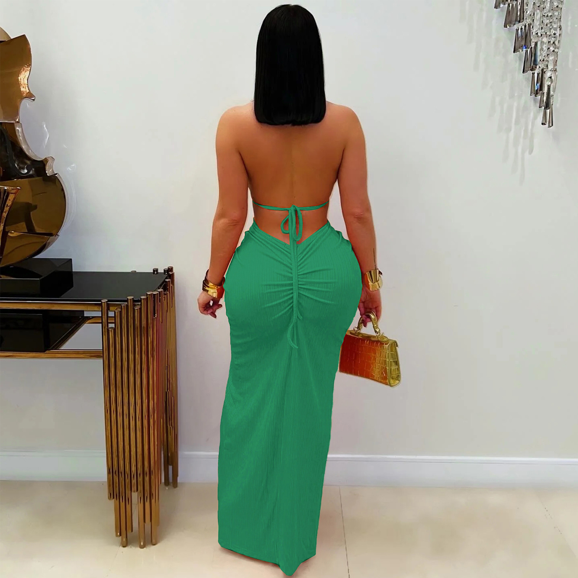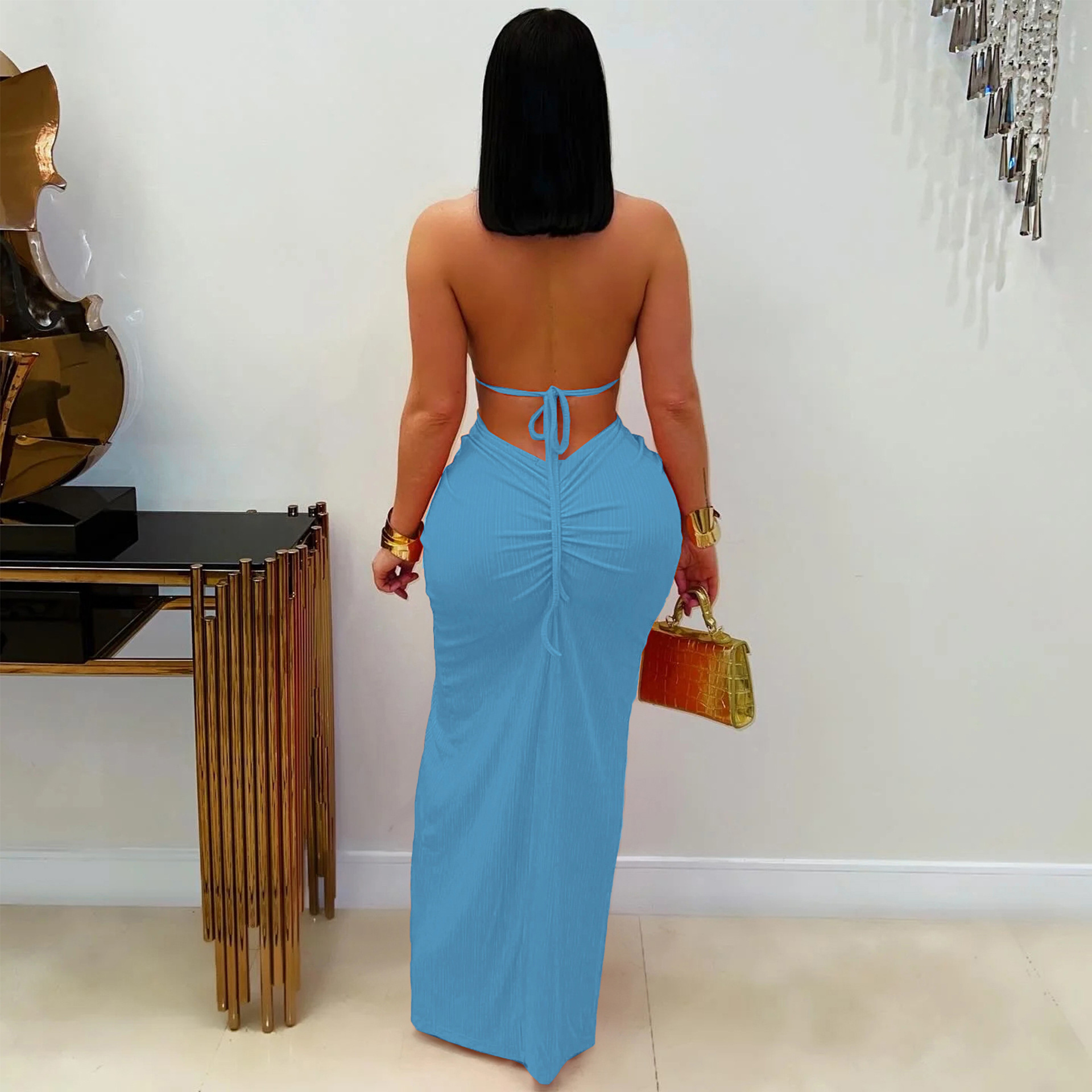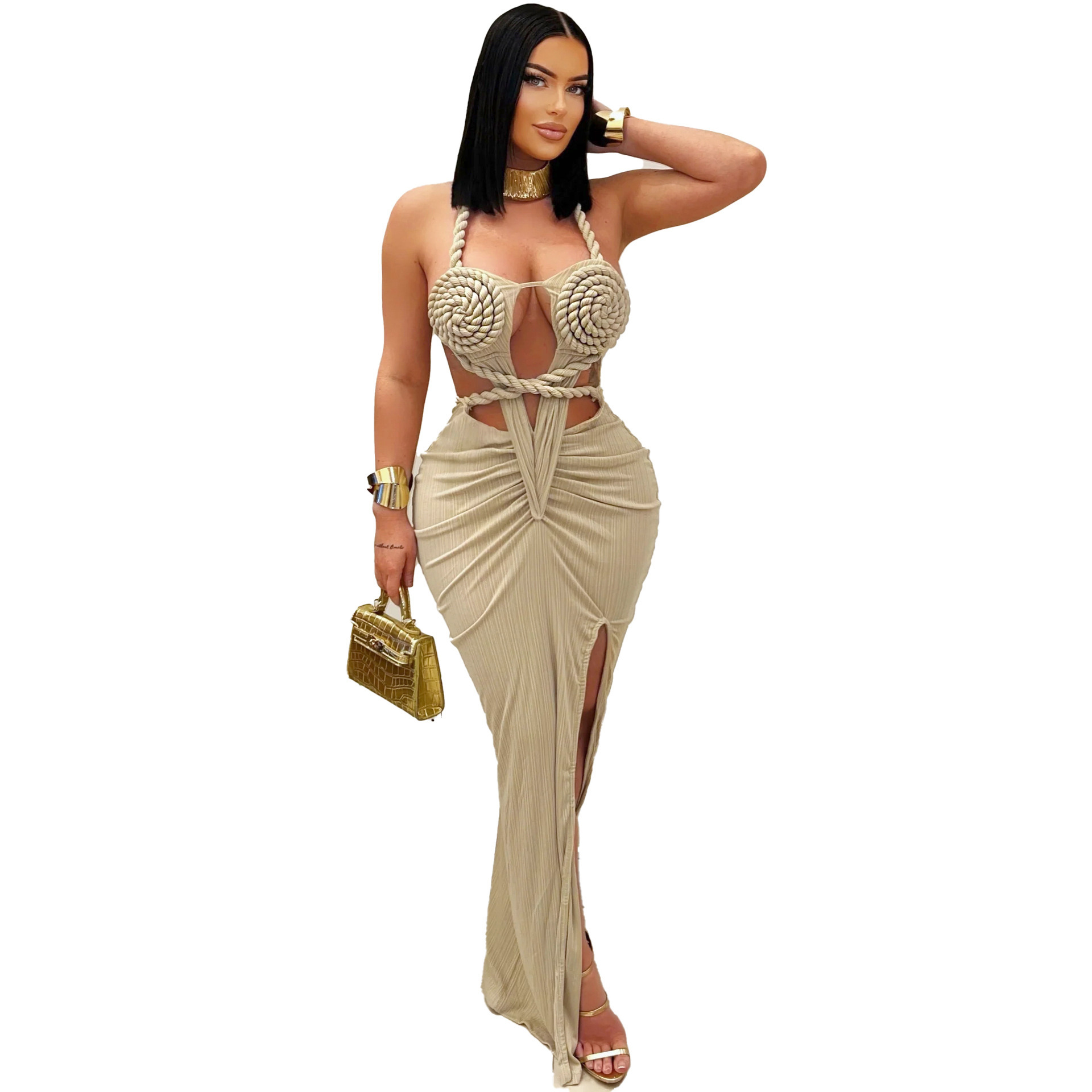 This Fashion Women's Halter Neck Knit Cut-Out Sexy Slit Dress Design Made Of Good Quality Polyster And Spandex Material, Which Is Stretchy, Durable And Comfortable. The Long Evening Dresses And Gowns Is Always The Mainly Choice For All Kinds Of Parties, Cocktail, Prom, Events, And Dating Occasions. Evening Gowns At Global Lover Comes With Huge Selections - Sequins, Beaded, Satin, Velvet, Lace.... When You Need Wholesale Evening Dresses, Global Lover Wholesale Women Garment Online Shop Is Your One-Stop Online Shopping Choice.
