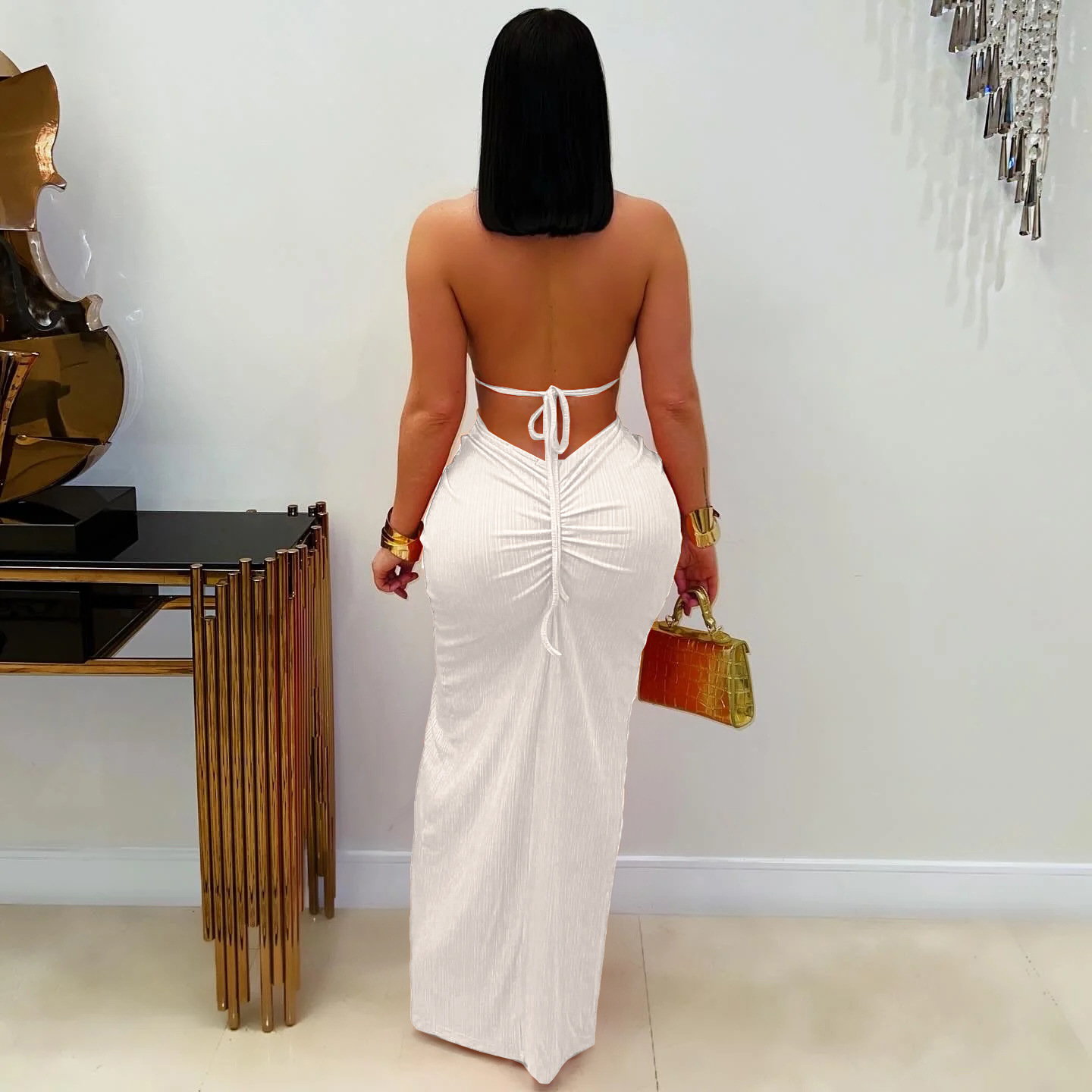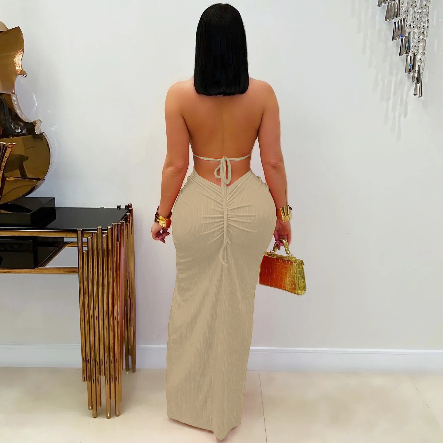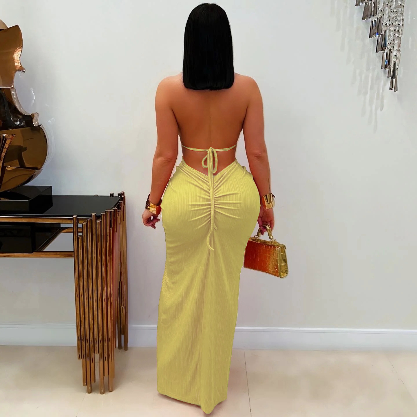 This Fashion Women's Halter Neck Knit Cut-Out Sexy Slit Dress Design Made Of Good Quality Polyster And Spandex Material, Which Is Stretchy, Durable And Comfortable. The Long Evening Dresses And Gowns Is Always The Mainly Choice For All Kinds Of Parties, Cocktail, Prom, Events, And Dating Occasions. Evening Gowns At Global Lover Comes With Huge Selections - Sequins, Beaded, Satin, Velvet, Lace.... When You Need Wholesale Evening Dresses, Global Lover Wholesale Women Garment Online Shop Is Your One-Stop Online Shopping Choice.