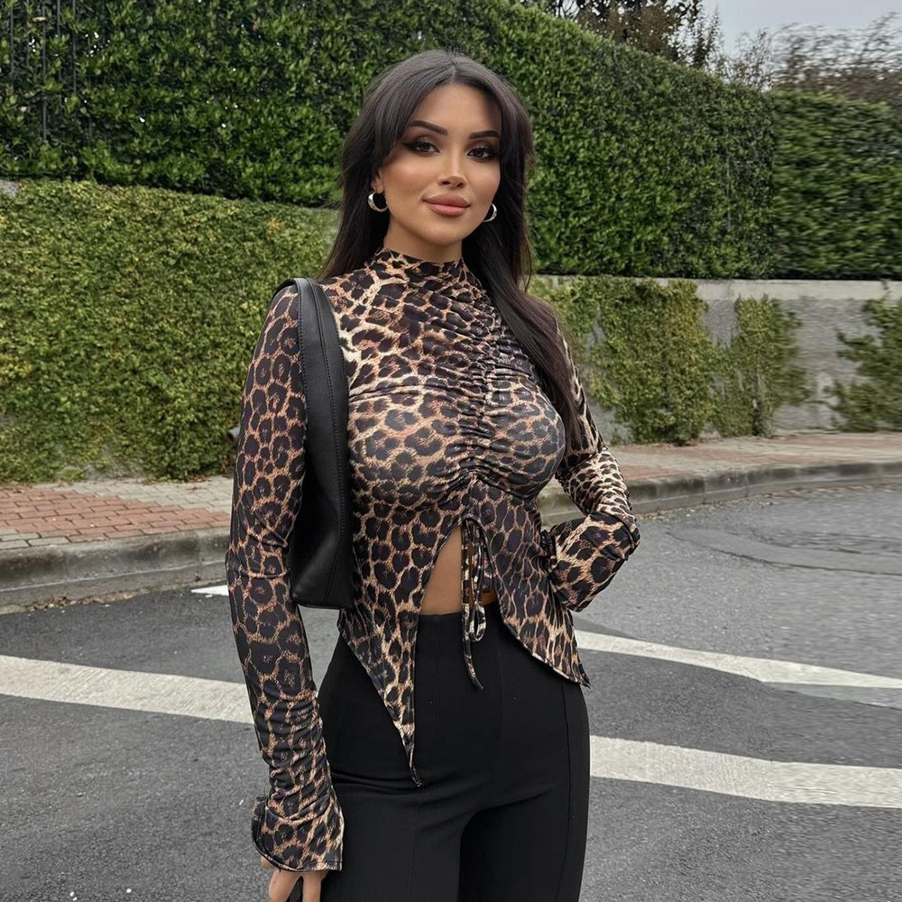 This Leopard Print Women's Drawstring Crop Top Tight Fitting Long Sleeve t-Shirt Design Made Of Thick Polyster And Spandex Materail, Which Is Soft And Comfortable. It Is a Must-Have Item For All Seasons. Global Lover Offer Most Fashionable Wholesale Women’s t Shirts - From Basic White And Black t Shirts To Lace, And Print t Shirts For Wholesale. We Also Make Customized Shirt With Your Personalized Logo And Print With Low Moq.