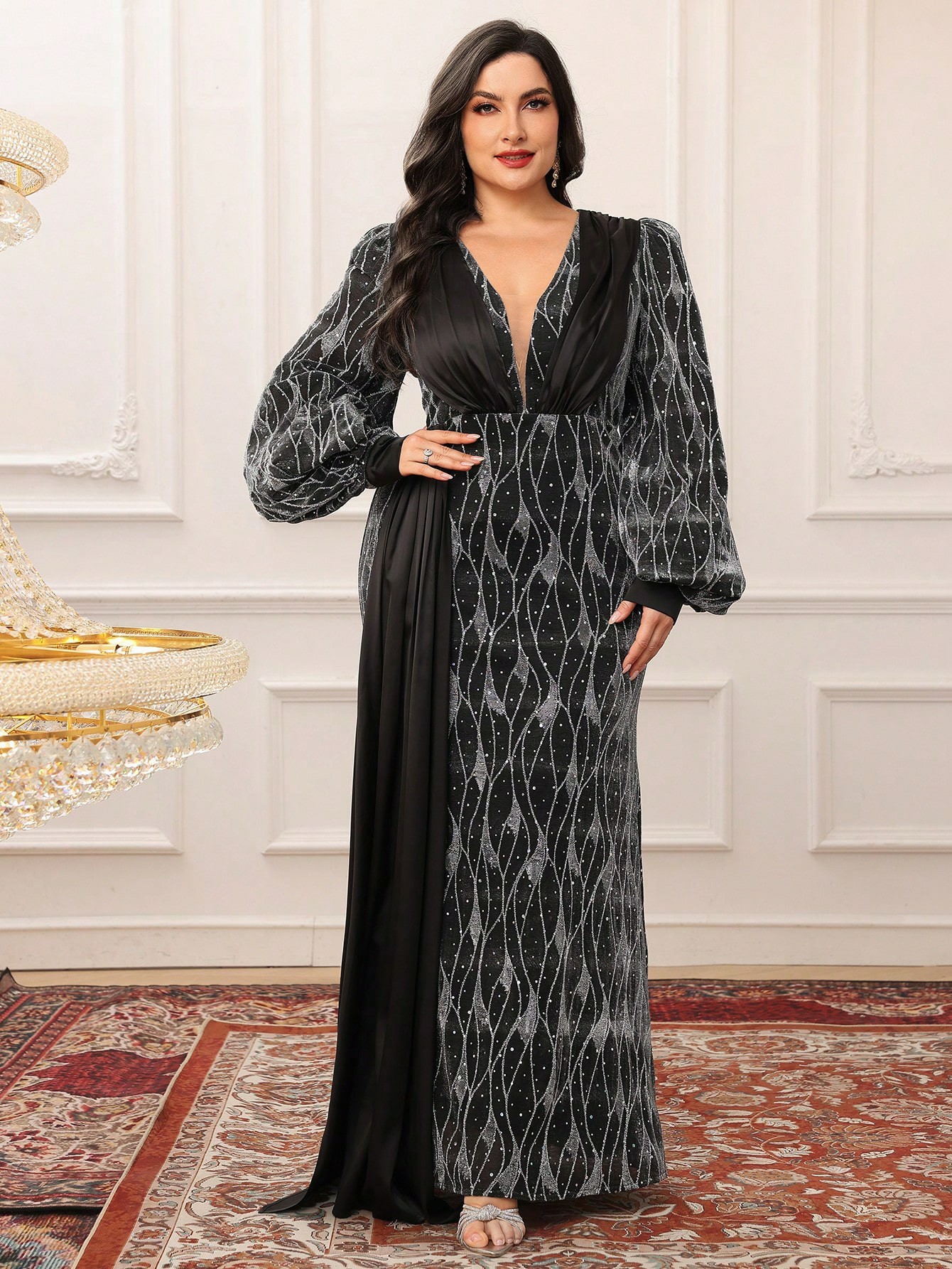Copy| Product Name | Plus Size Women Sequined Patchwork Puff Sleeve Evening Dress |