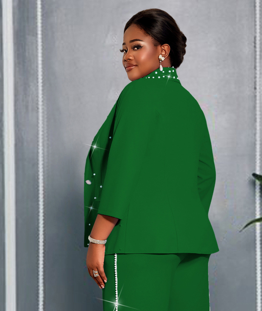 Copy| Product Name | Plus Size Women's Career Turndown Collar Green Beaded Three-Quarter Sleeve Slim Fit Blazer Dress |