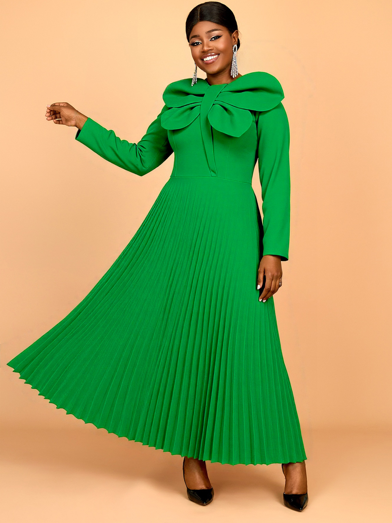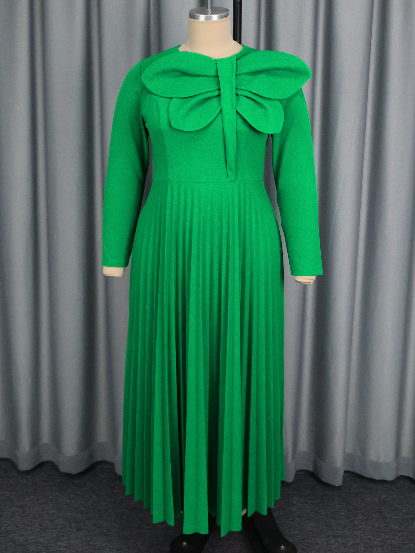 Copy| Product Name | Plus-size Women green large bow pleated long-sleeved elegant dress |