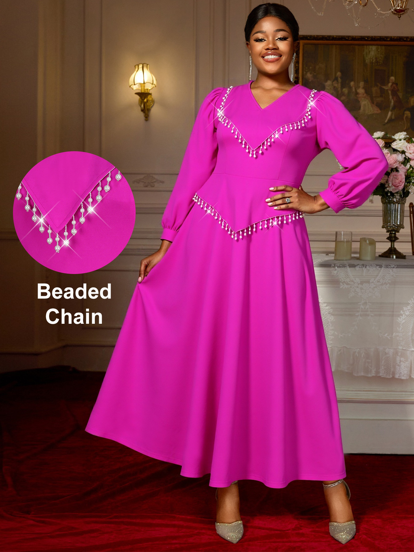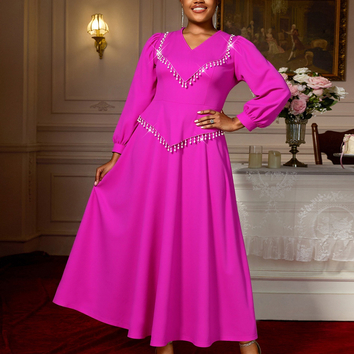 Copy| Product Name | Plus-size Women rose beaded tassel long-sleeved elegant V-neck dress |