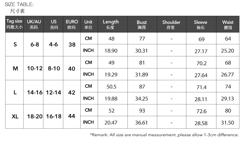 High Elasticity Fabric:Please add 0-0.5 CM from the garment size to body size.