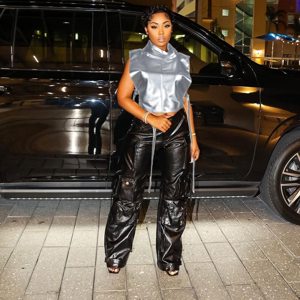 Copy| Product Name | Summer Women High-Neck Sleeveless Lace-Up Pu Leather Vest |