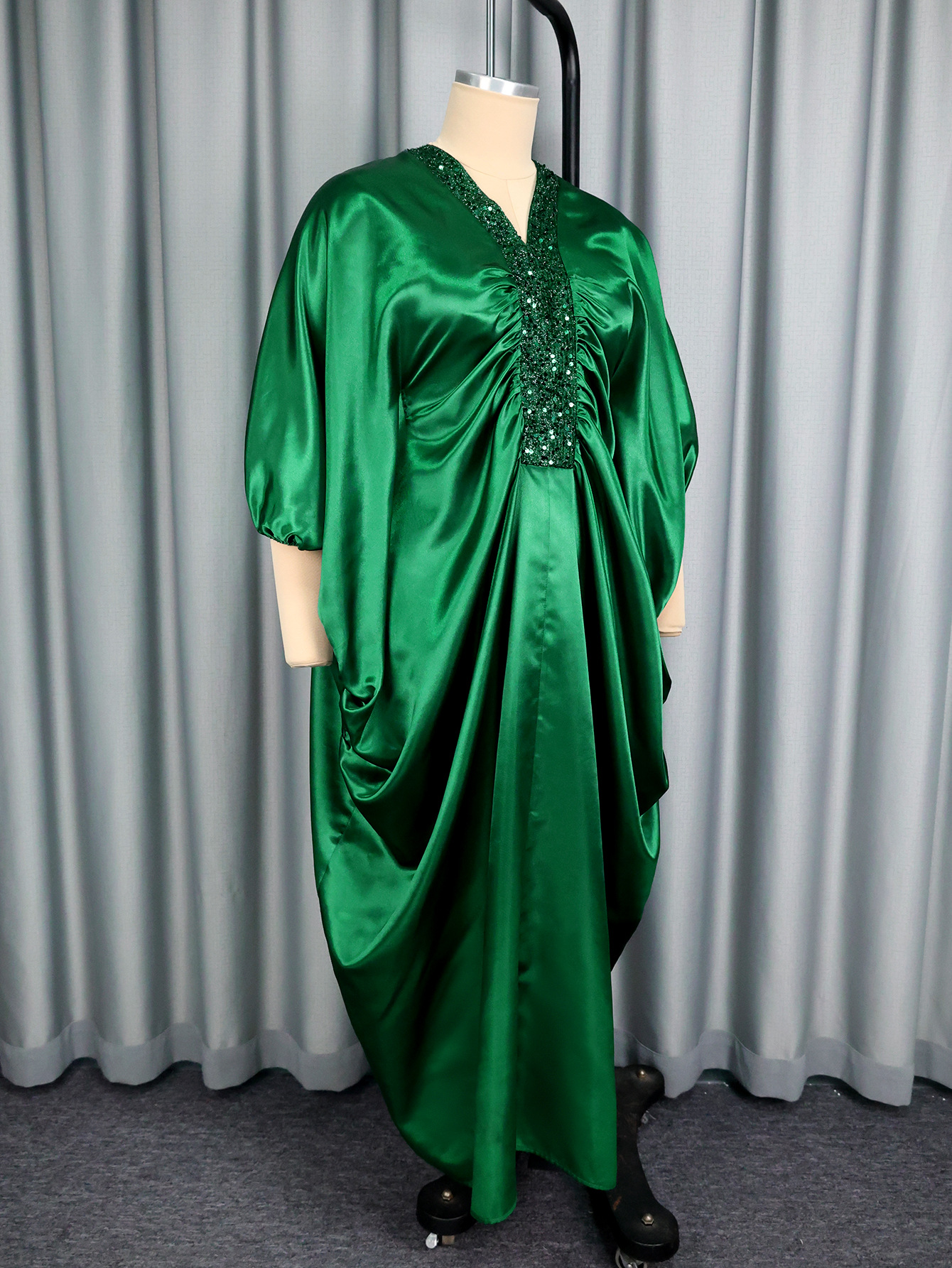 Copy| Product Name | V-Neck Patchwork Sequin Bat Sleeve Gown Pleated Slim Waist Loose African Formal Party Evening Dress |