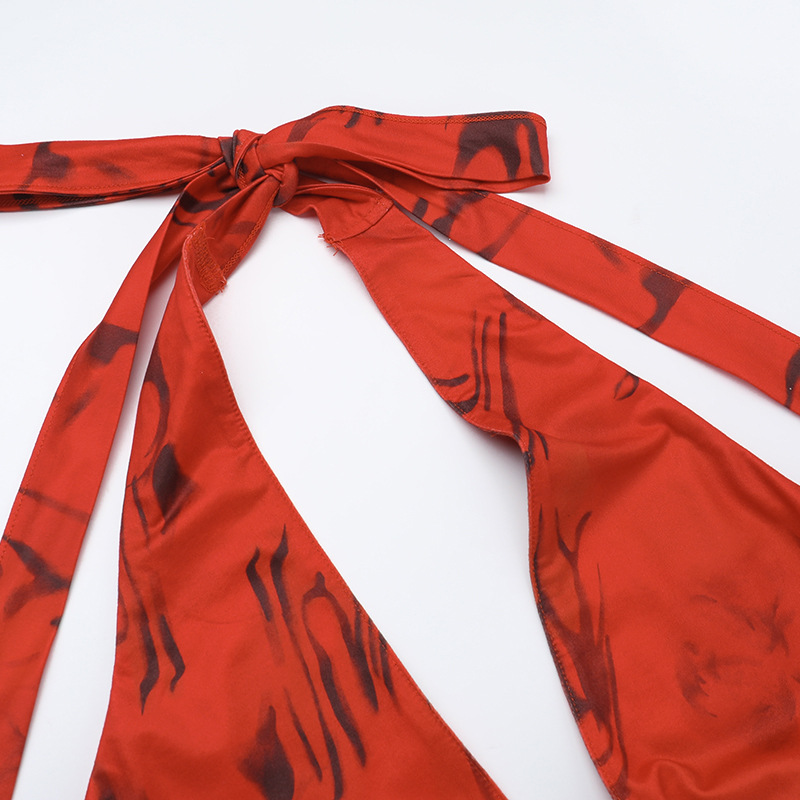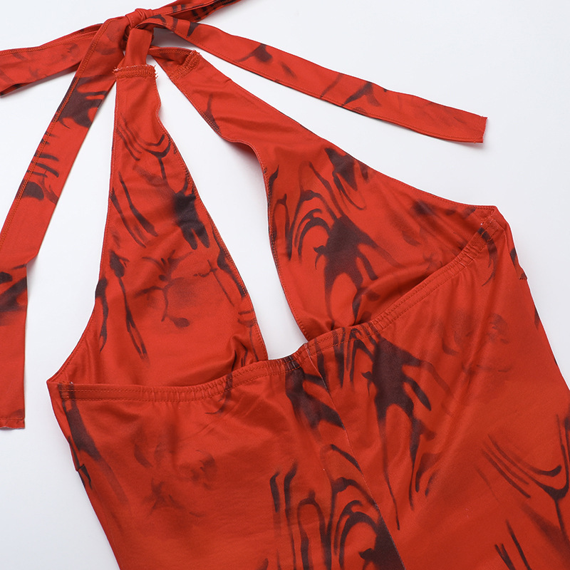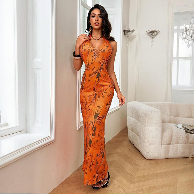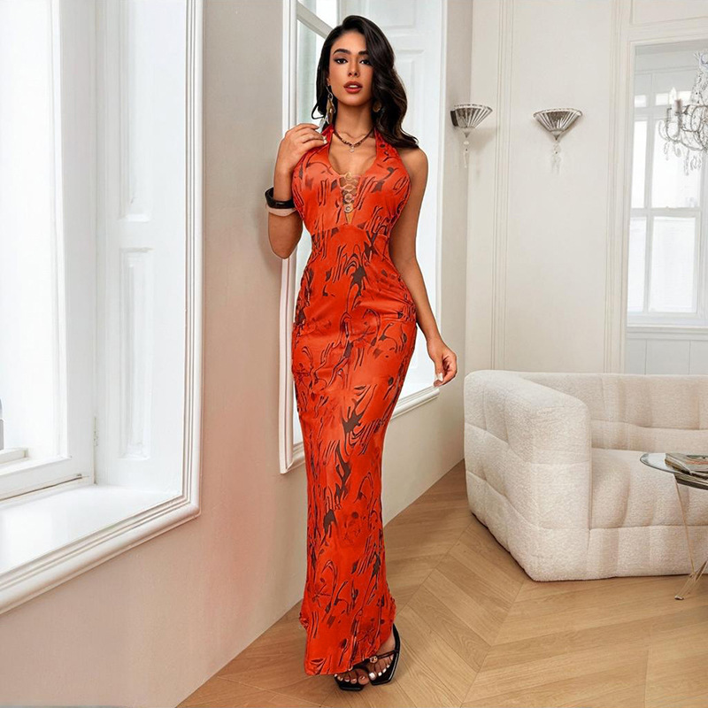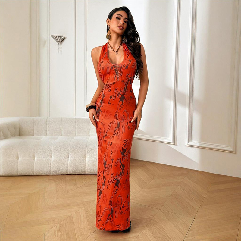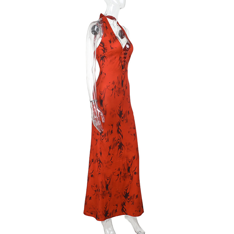 Copy| Product Name | V-Neck Print Halter Neck Low Back Autumn Sexy Slim Fit Long Dress |