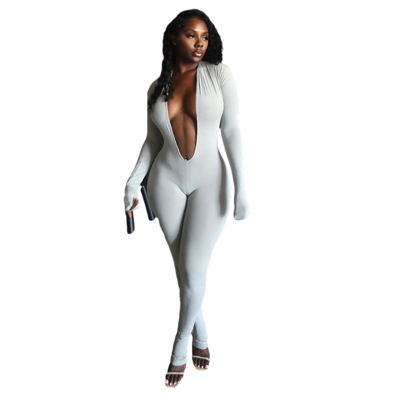 Copy| Product Name | Women’s Sexy Deep V-Neck Long Sleeve Solid Tight-Fitting Jumpsuit |