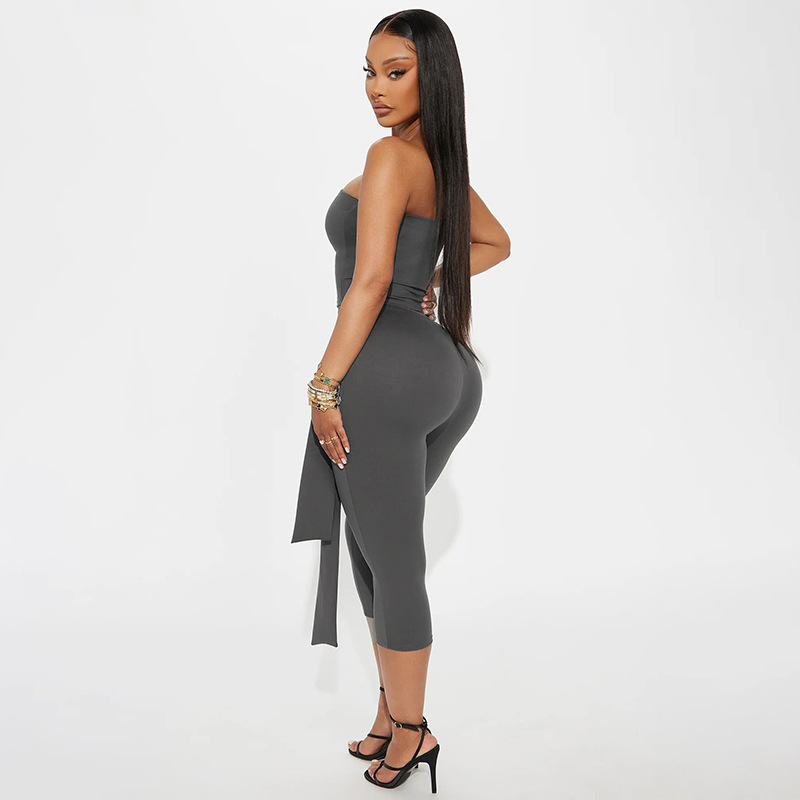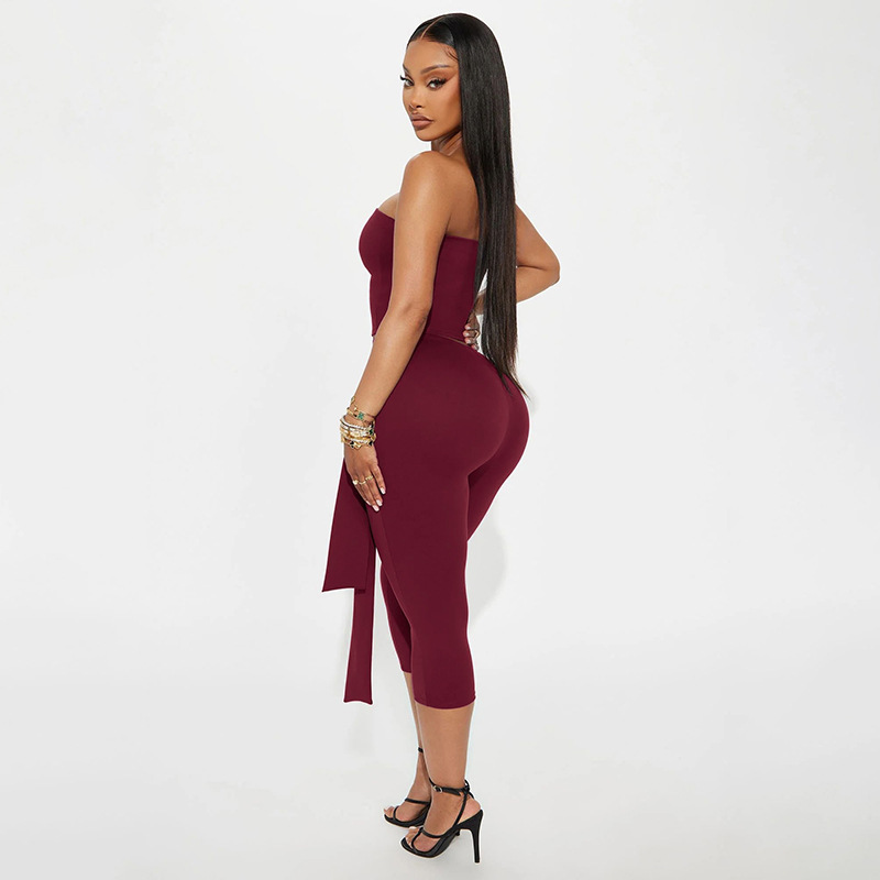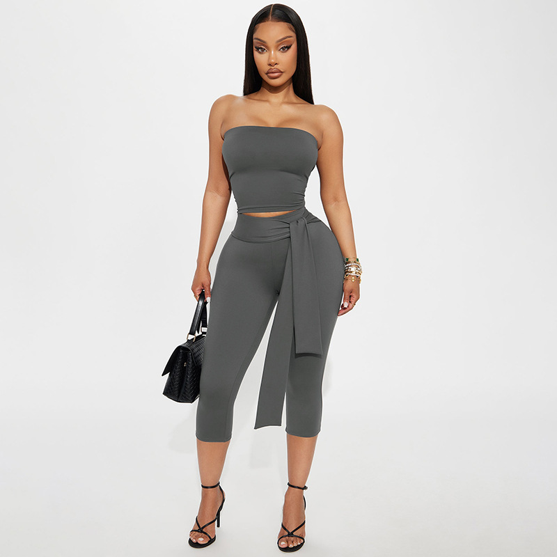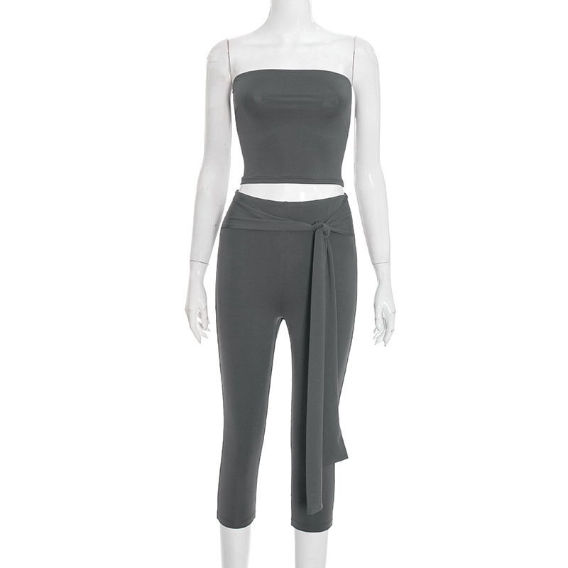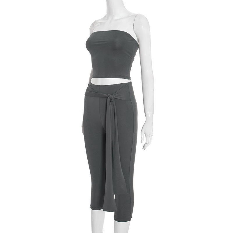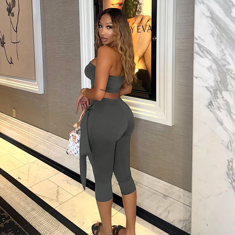 Copy| Product Name | Women Autumn Strapless Crop Top Solid Tie-Up Ribbon Capri Pants Two-Piece Set |