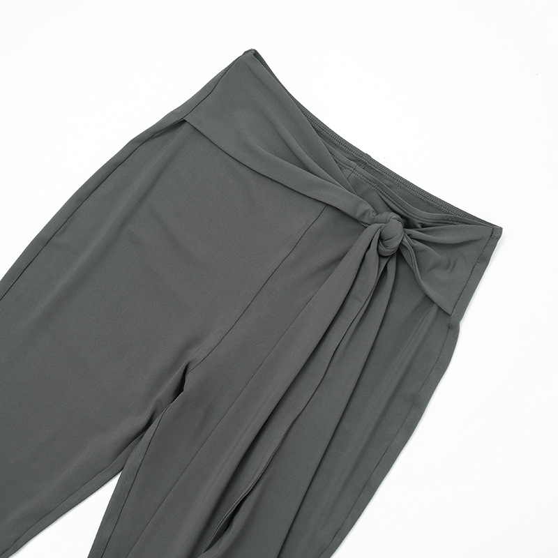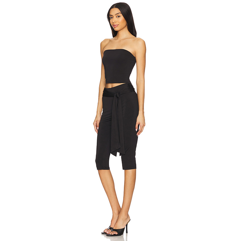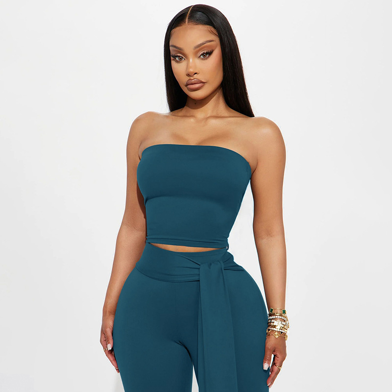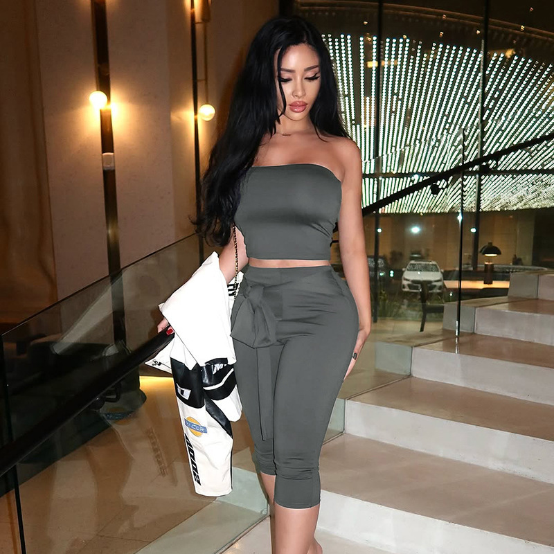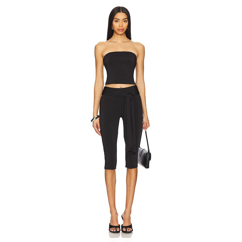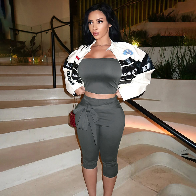Copy| Product Name | Women Autumn Strapless Crop Top Solid Tie-Up Ribbon Capri Pants Two-Piece Set |