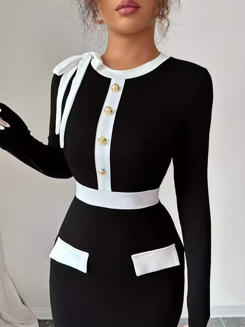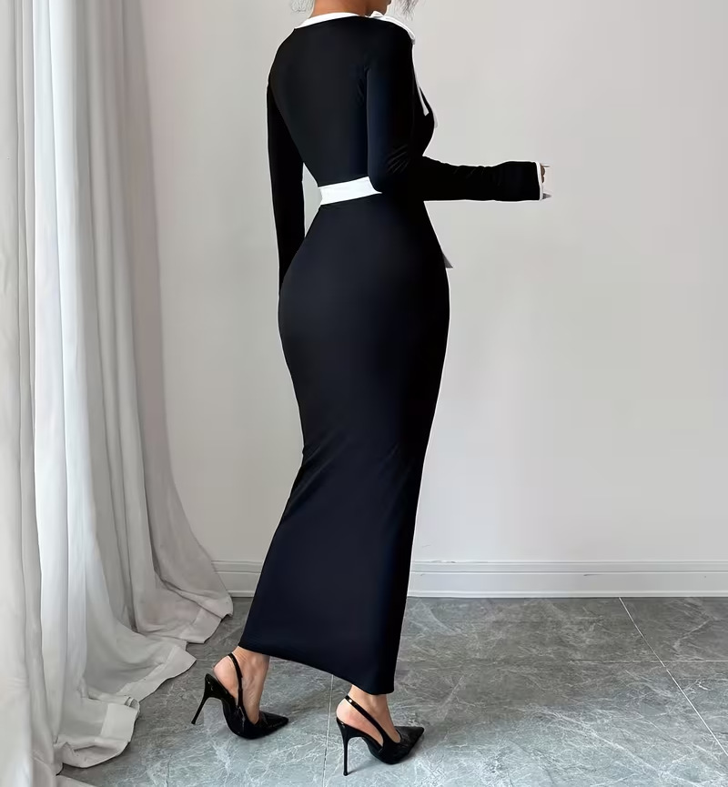 Copy| Product Name | Women Autumn/Winter Chic Slim-Fit Black & White Color-Block Bodycon Long Dress |