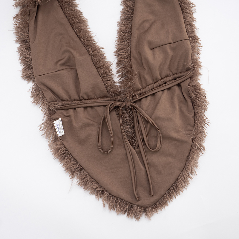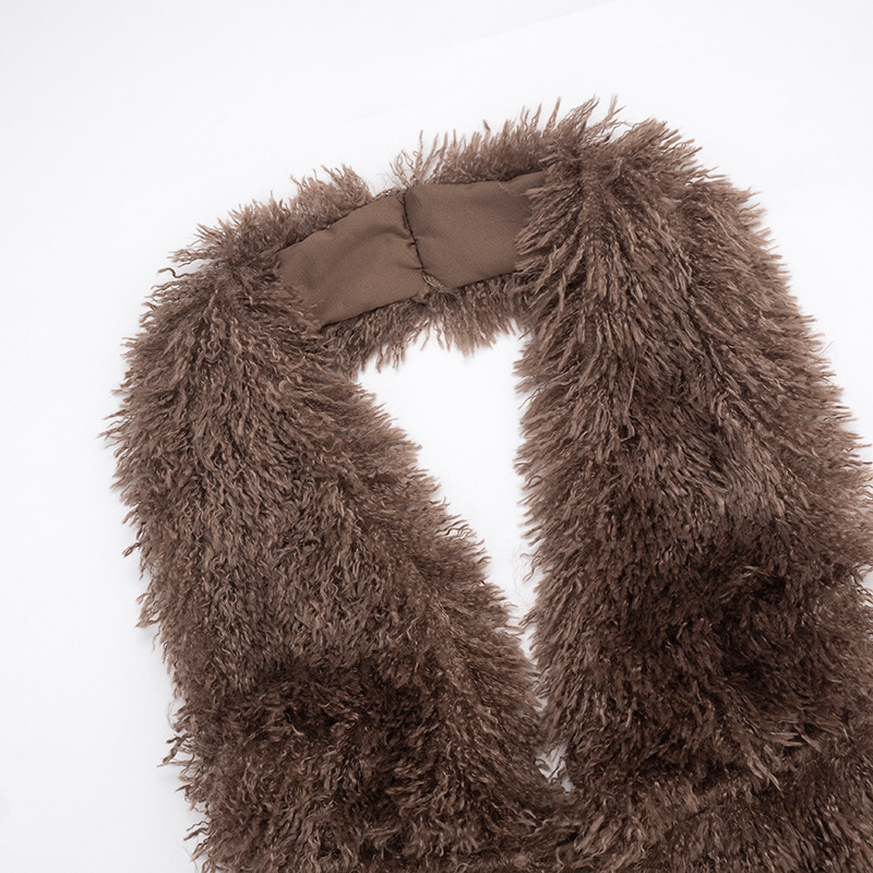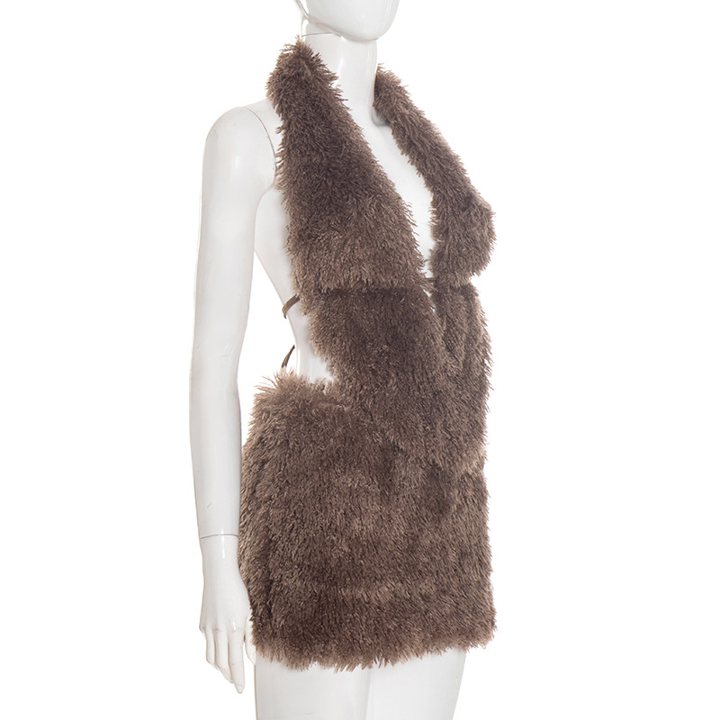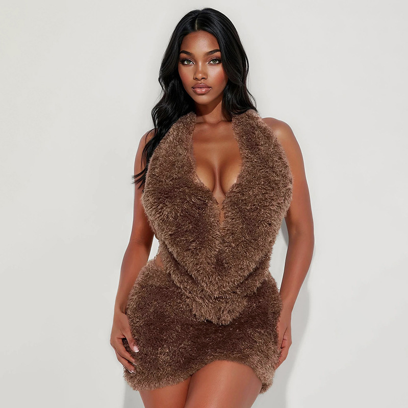 Copy| Product Name | Women Autumn/Winter Furry Collar Lace-Up Backless Top and Skirt Two-Piece Set |