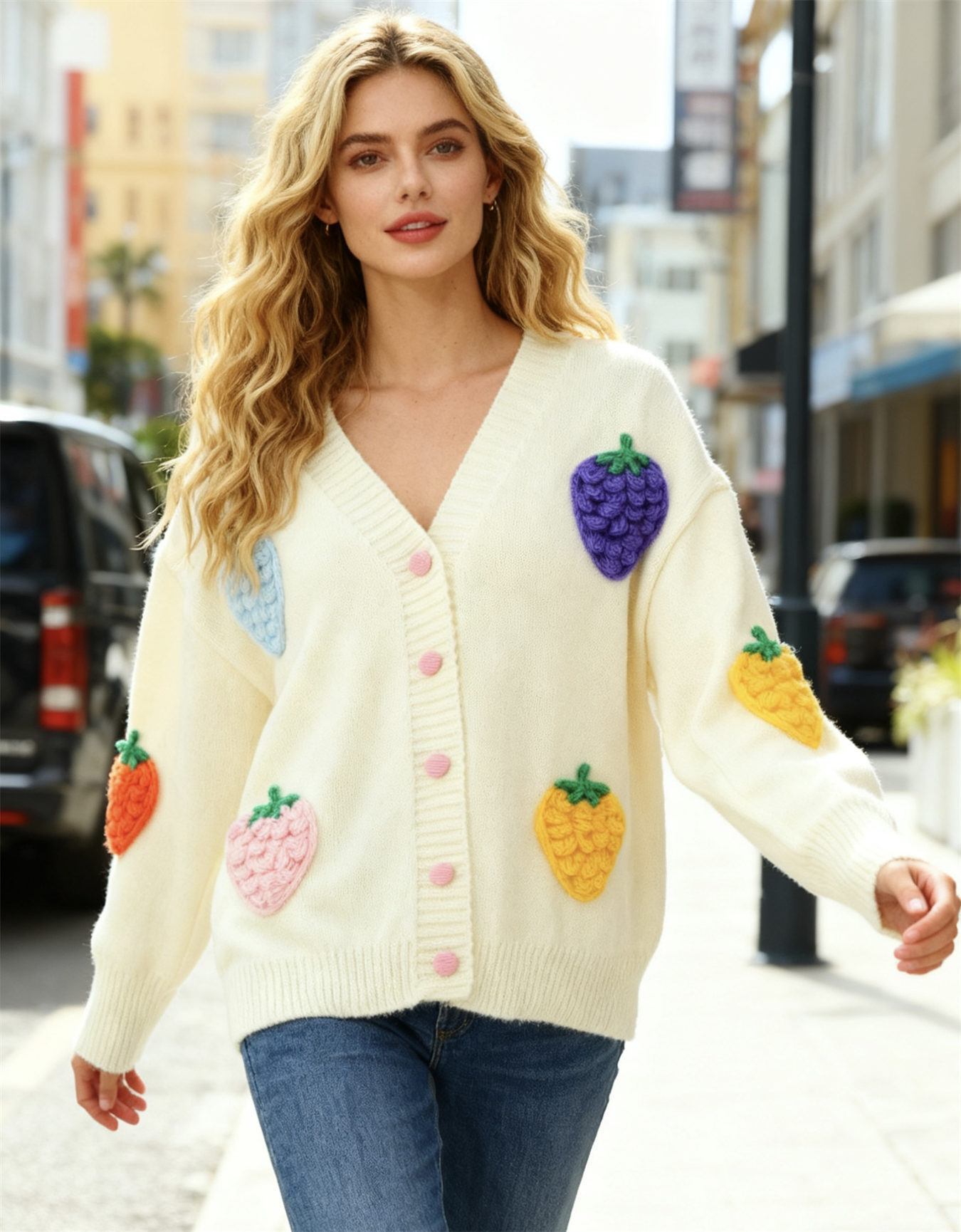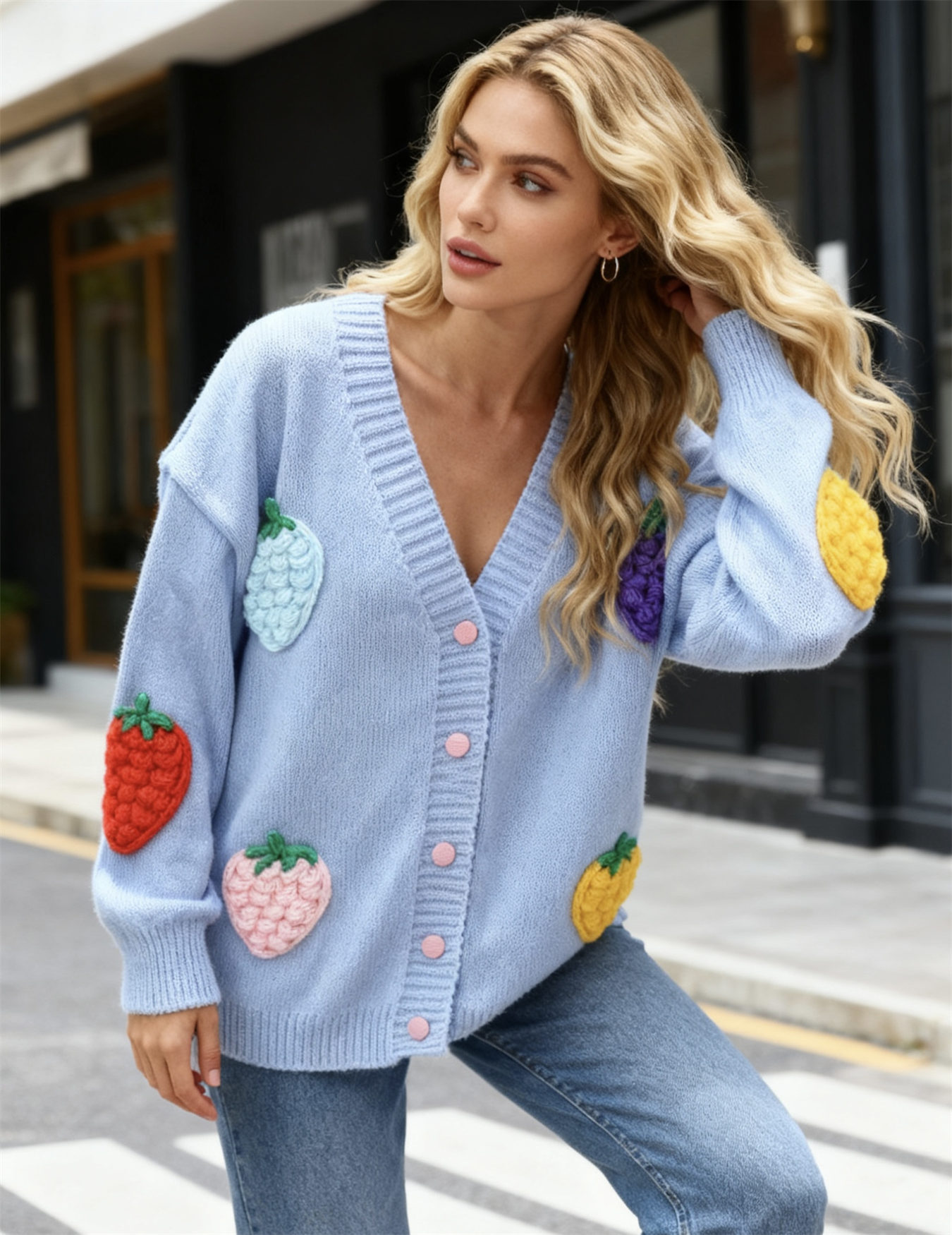 This Women Autumn/Winter Strawberry Jacquard Casual Knitting Sweater Is An Indispensable Beautiful Scenery In Cozy Winter. Women’s Wholesale Sweaters And Cardigans At Global Lover Combine The Warm And Fashion. Best Oversized Sweaters Has Long Been The Mainly Favorite. It’s So Easy To Match a Large Sweater, Sometimes The Coat Can Be Ignored. Oversized Sweater With Short Skirt Is Dignified And Attractive. Oversized Sweater With Skirt Is Elegant And Sweet. Oversized Sweaters With Over-The-Knee Boots Can Easily Create a Sense Of Maturity And Femininity. Oversized Sweaters Paired With Shorts Are Full Of Youthful Vitality And Look More Dynamic And Energetic!