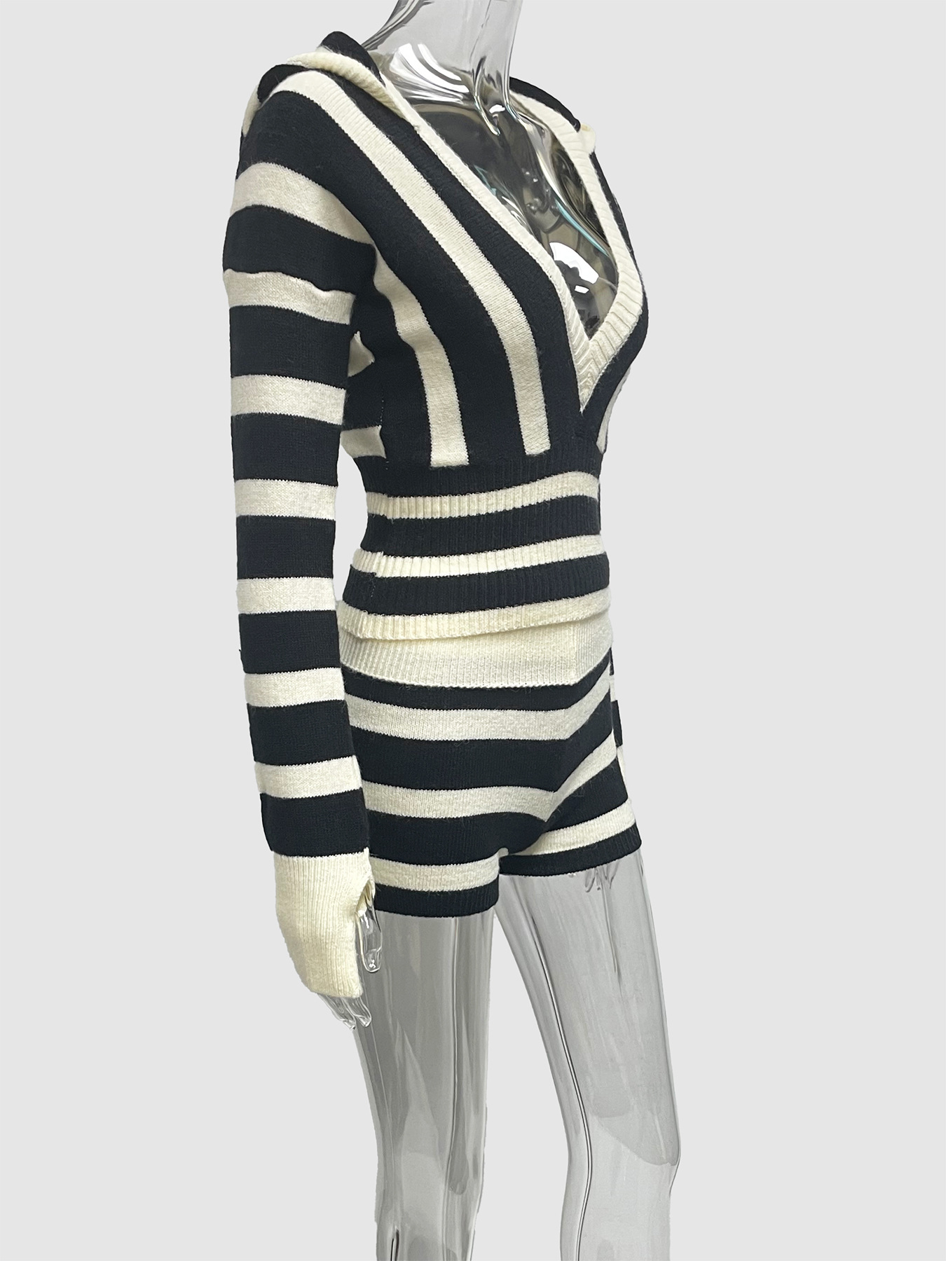 Copy| Product Name | Women Fall Hooded Long-Sleeved Striped Contrast Top and Shorts Two-Piece Set |