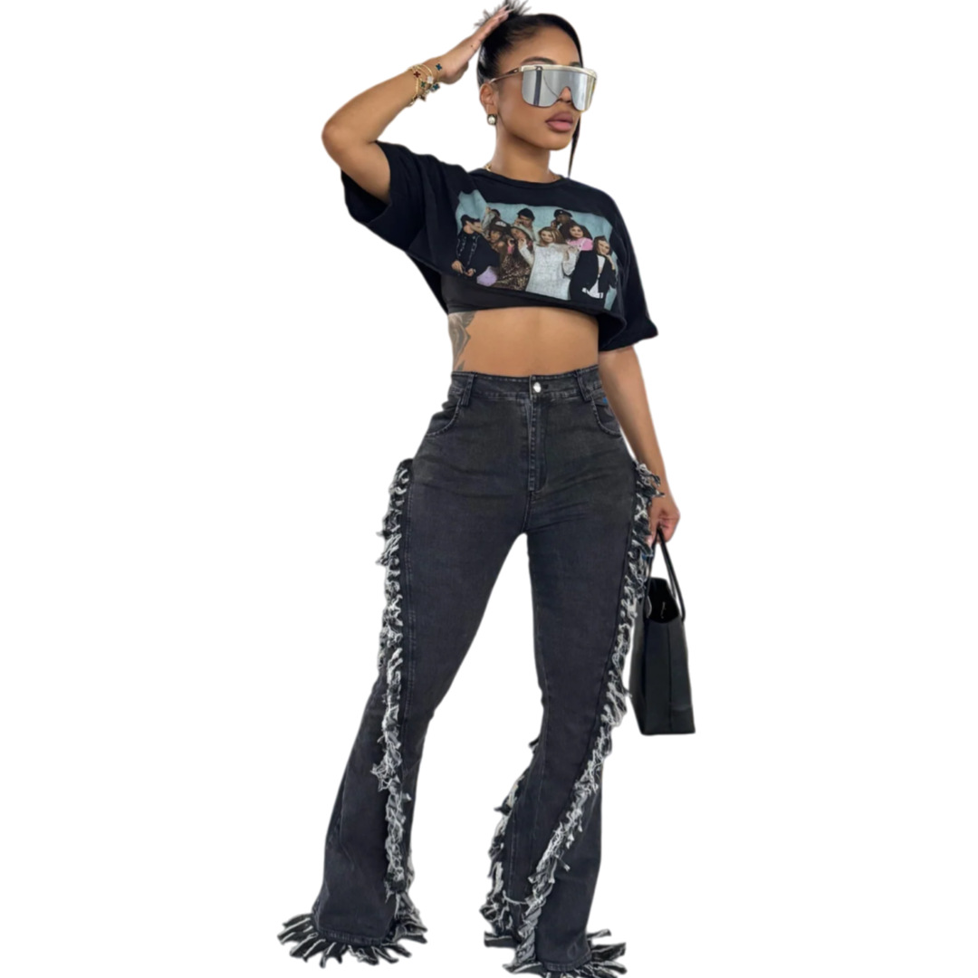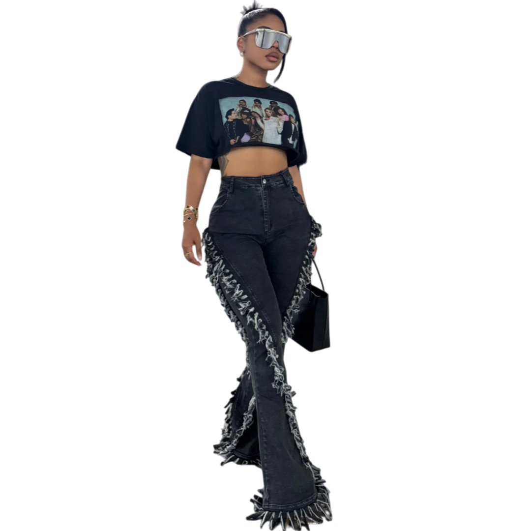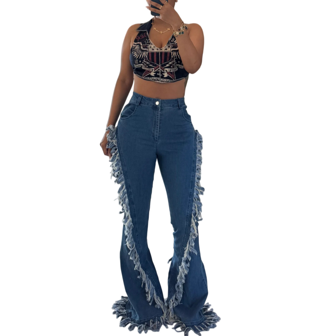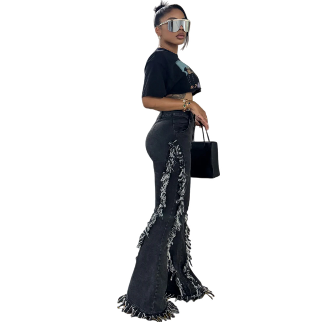 Copy| Product Name | Women Fringed Stretchy Bell Bottom Denim Pants |