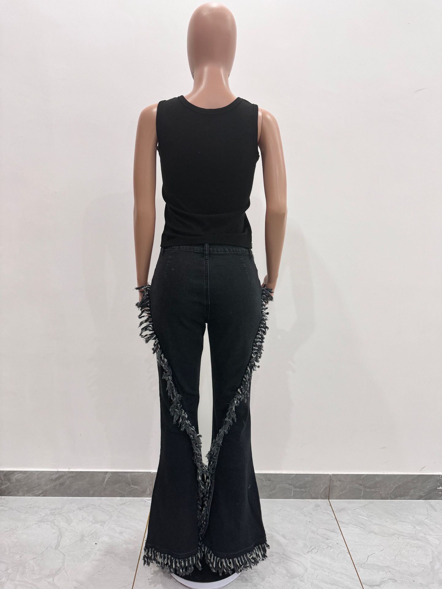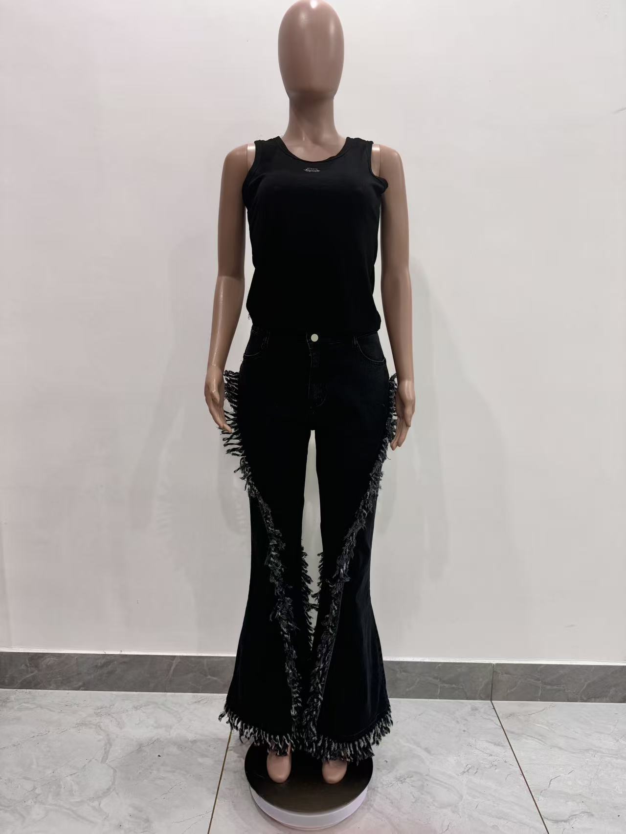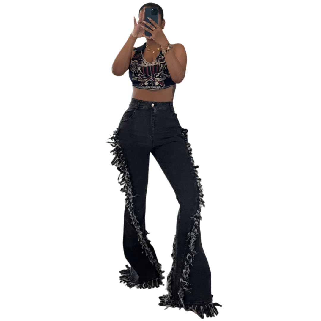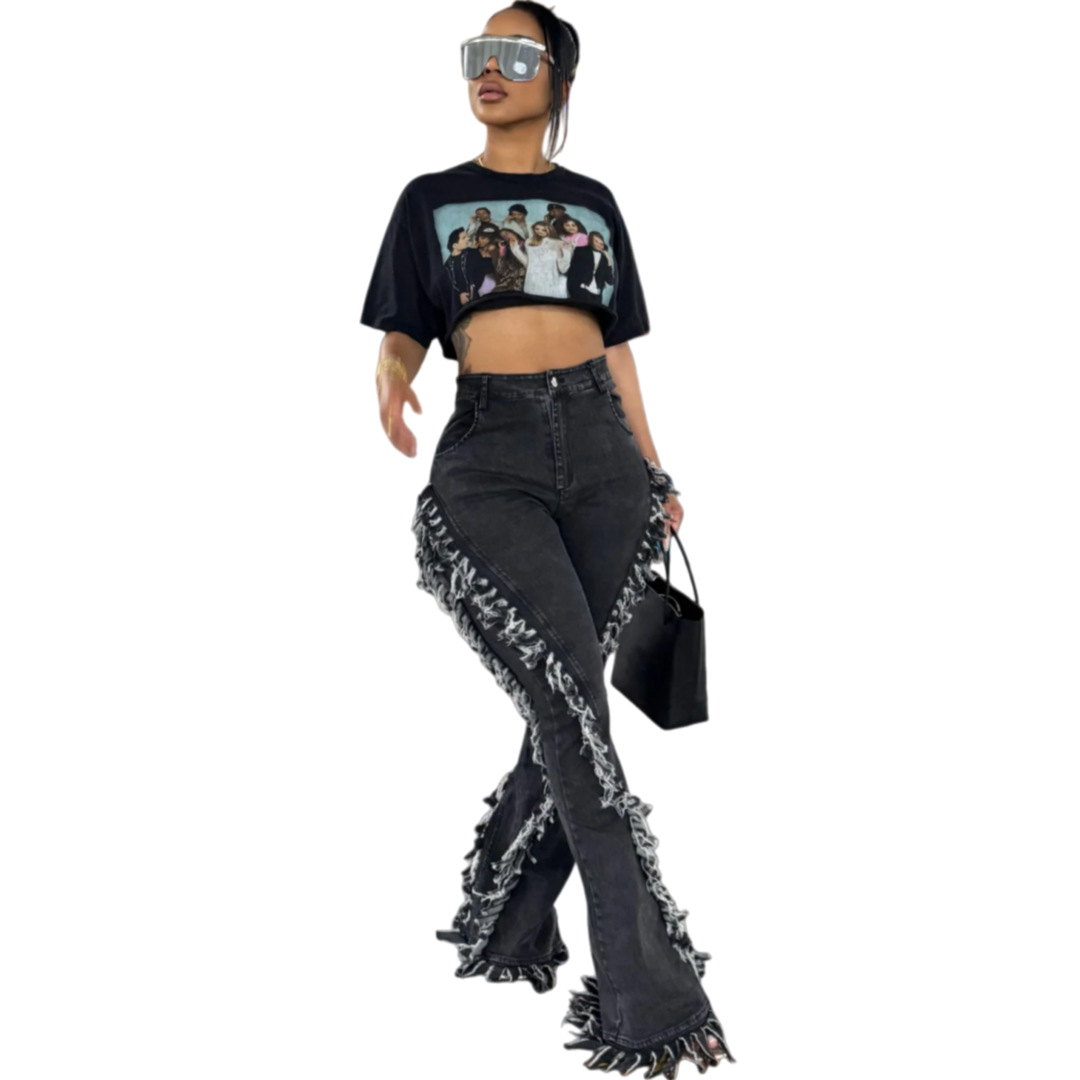 Copy| Product Name | Women Fringed Stretchy Bell Bottom Denim Pants |