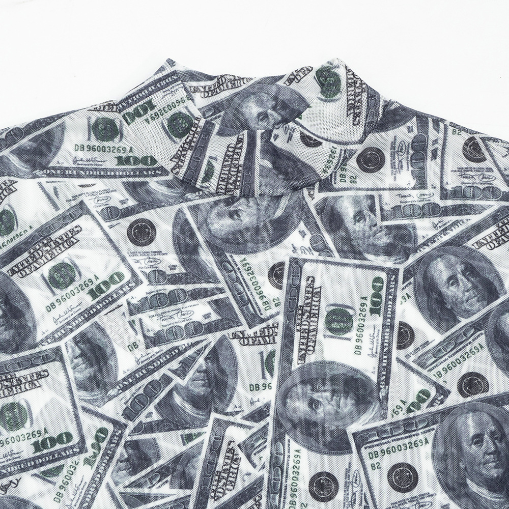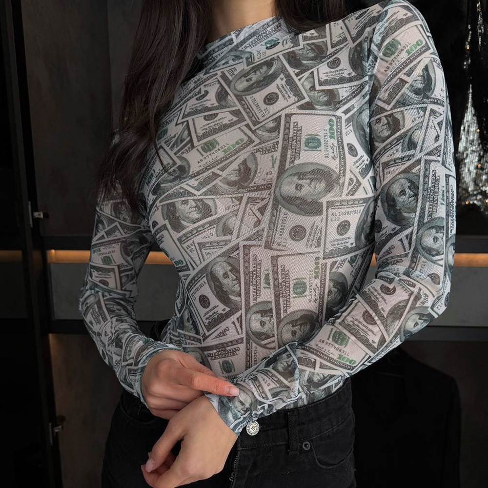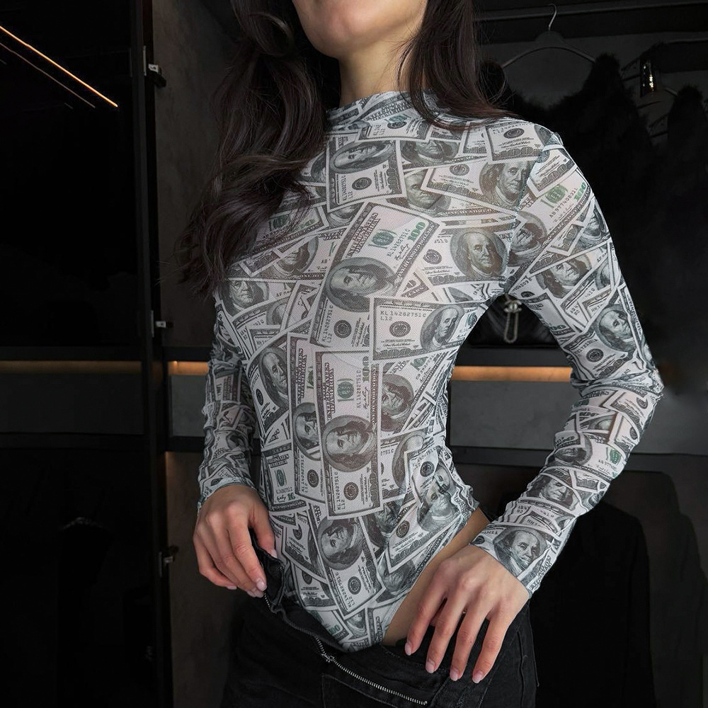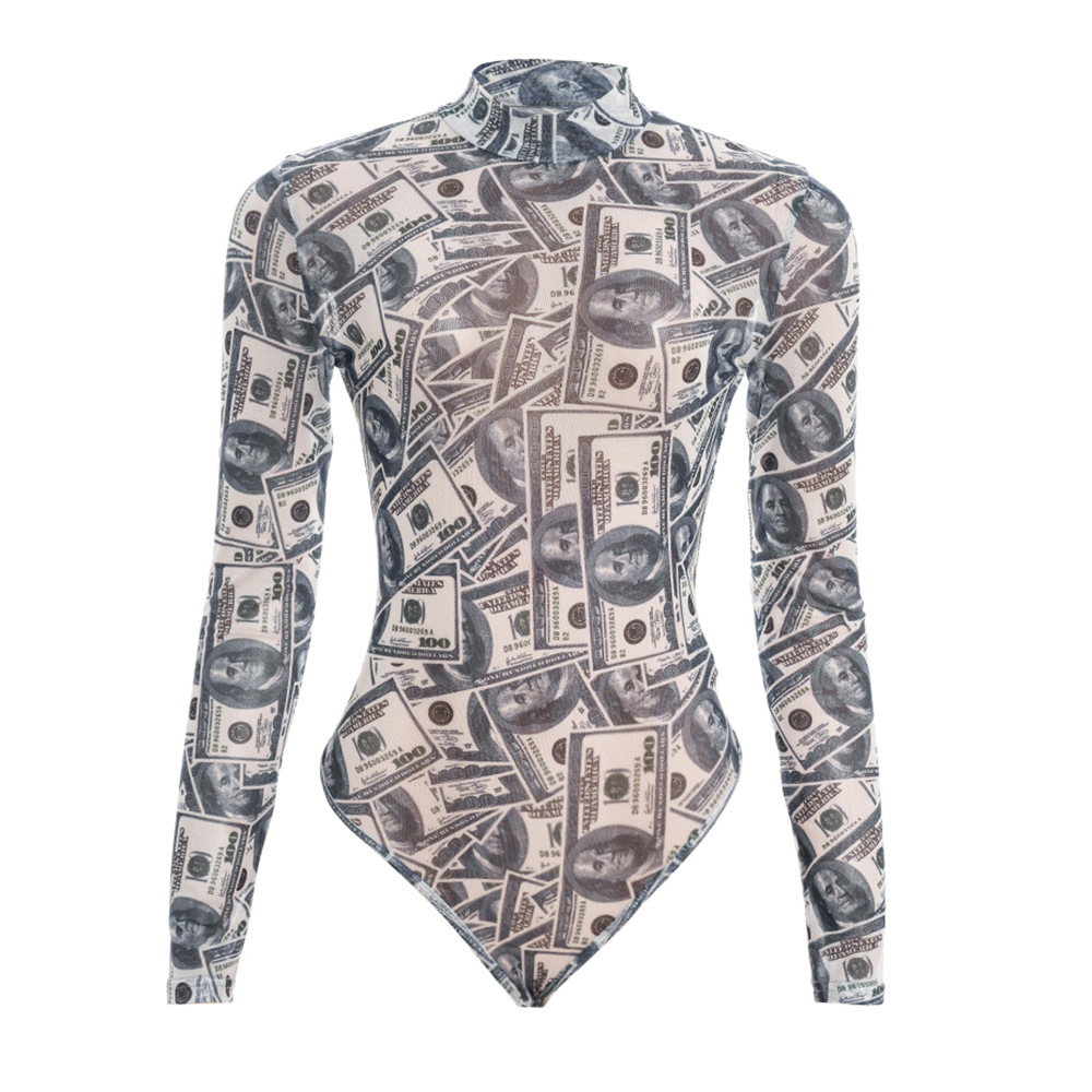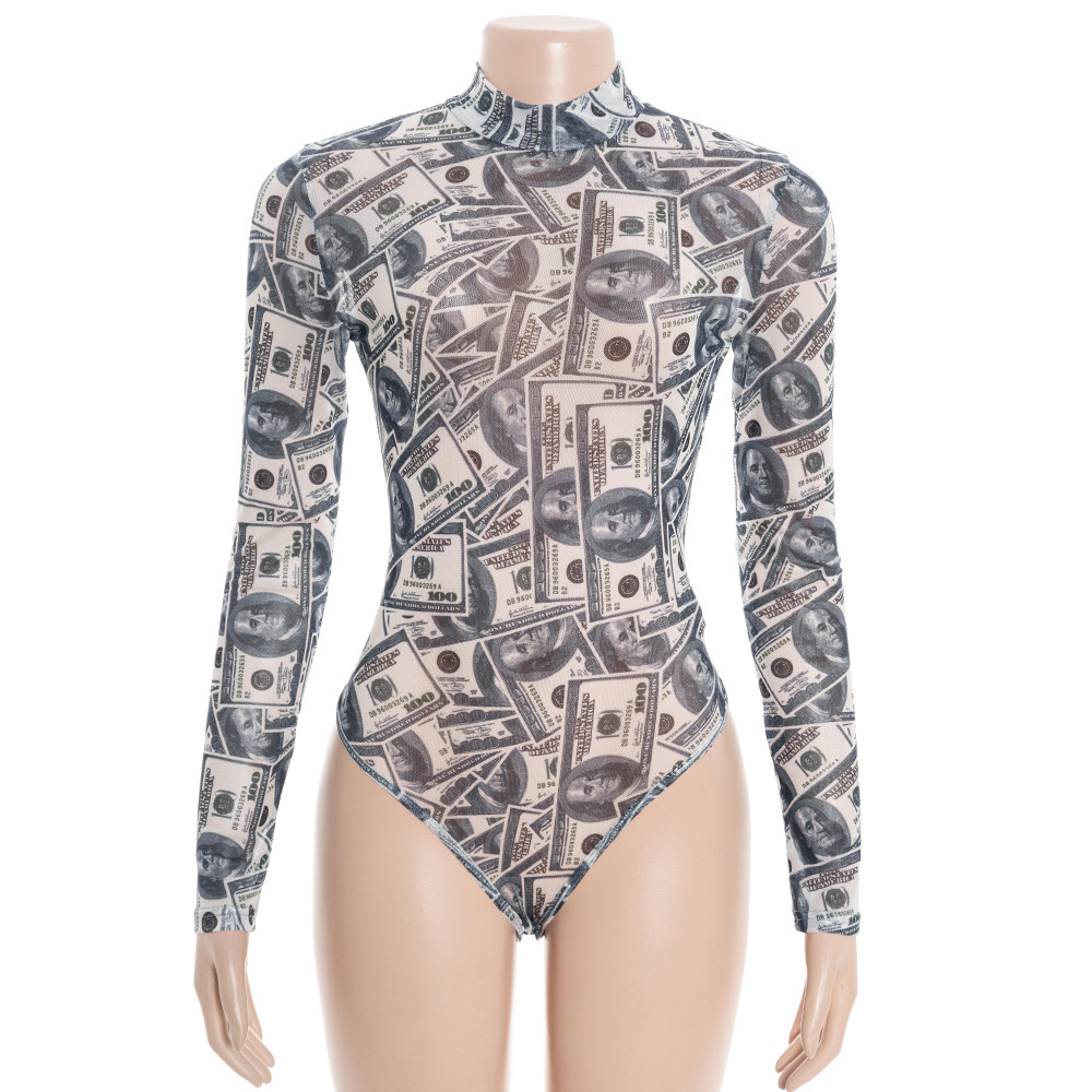 Copy| Product Name | Women High-Neck Long-Sleeve All-Over Dollar Print Mesh See-Through Bodysuit |