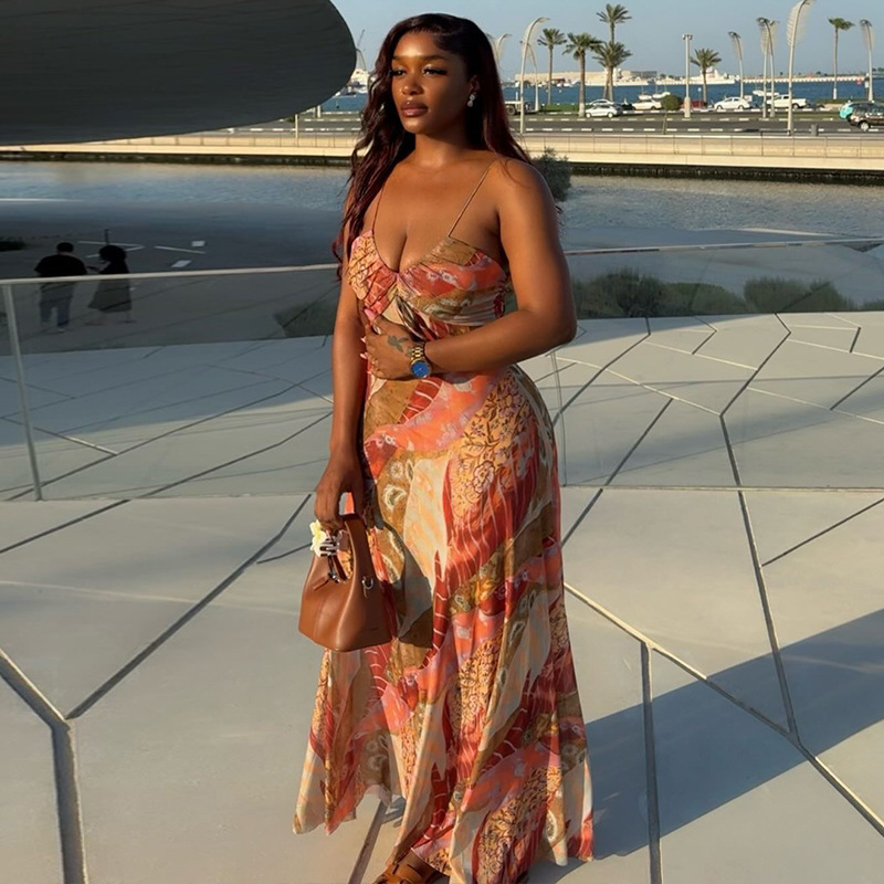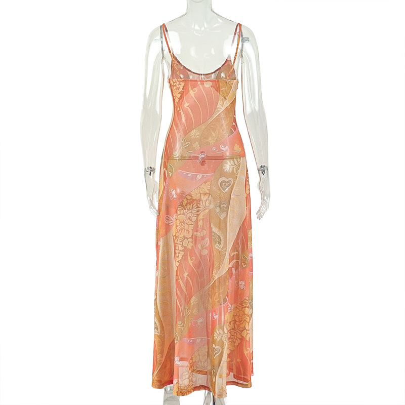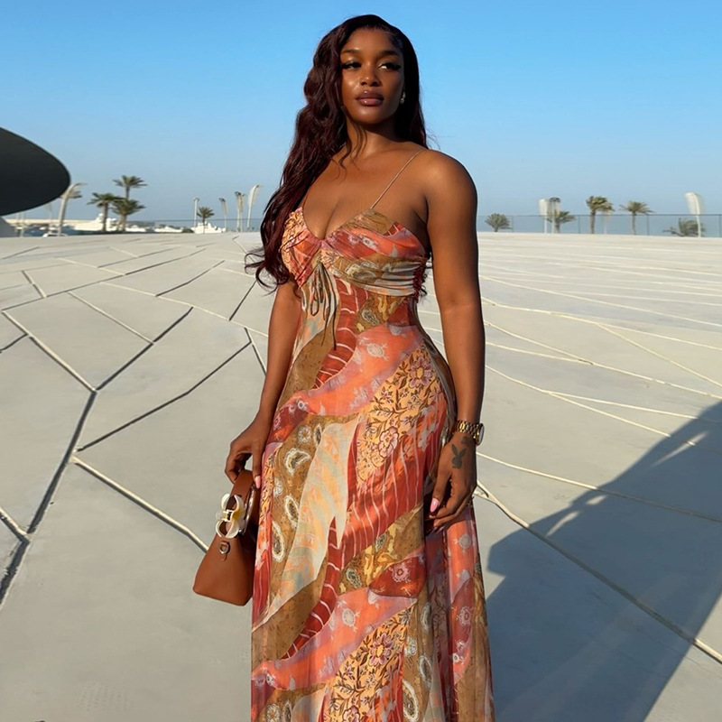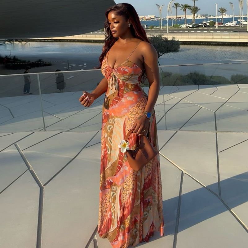 Copy| Product Name | Women Printed Low-Back Strap Holiday Maxi Dress |
