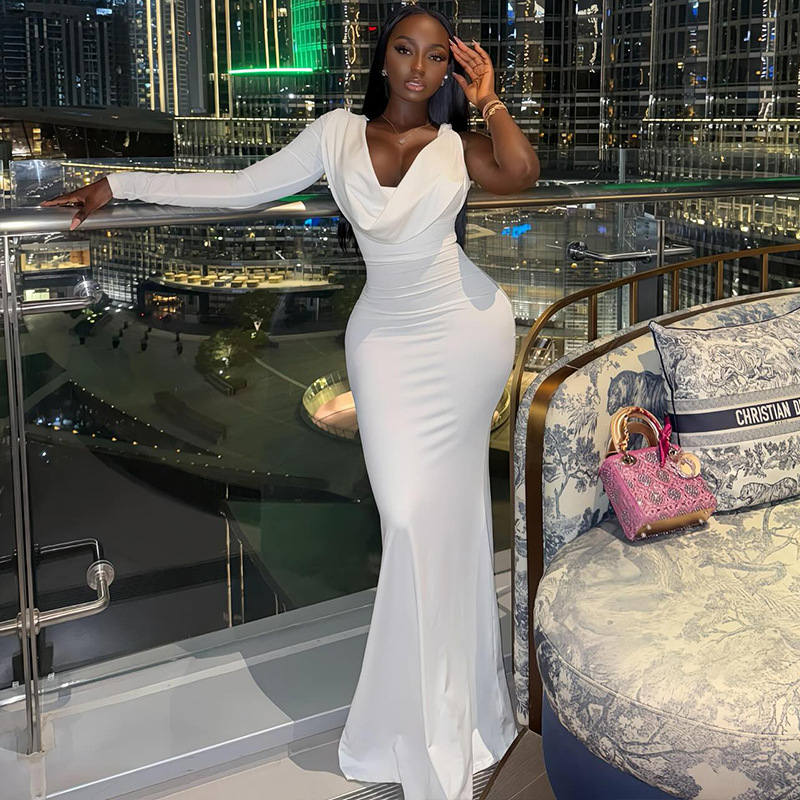 Copy| Product Name | Women Ruched Solid Slim-Fit Cowl Neck Mermaid Maxi Dress |