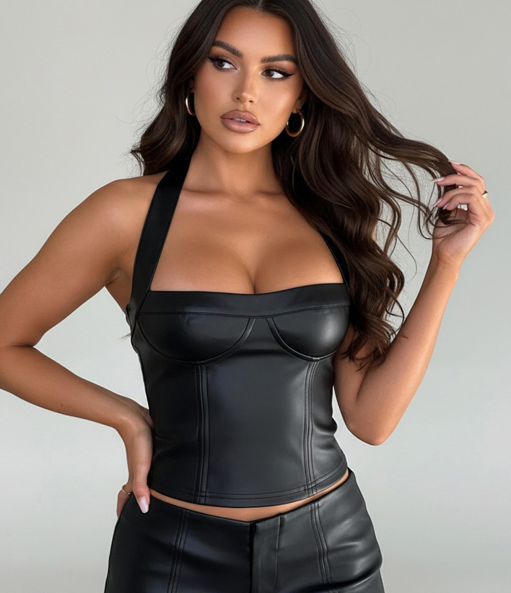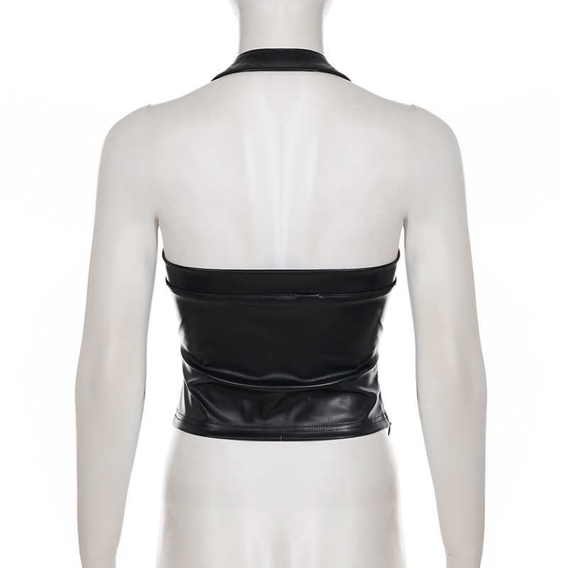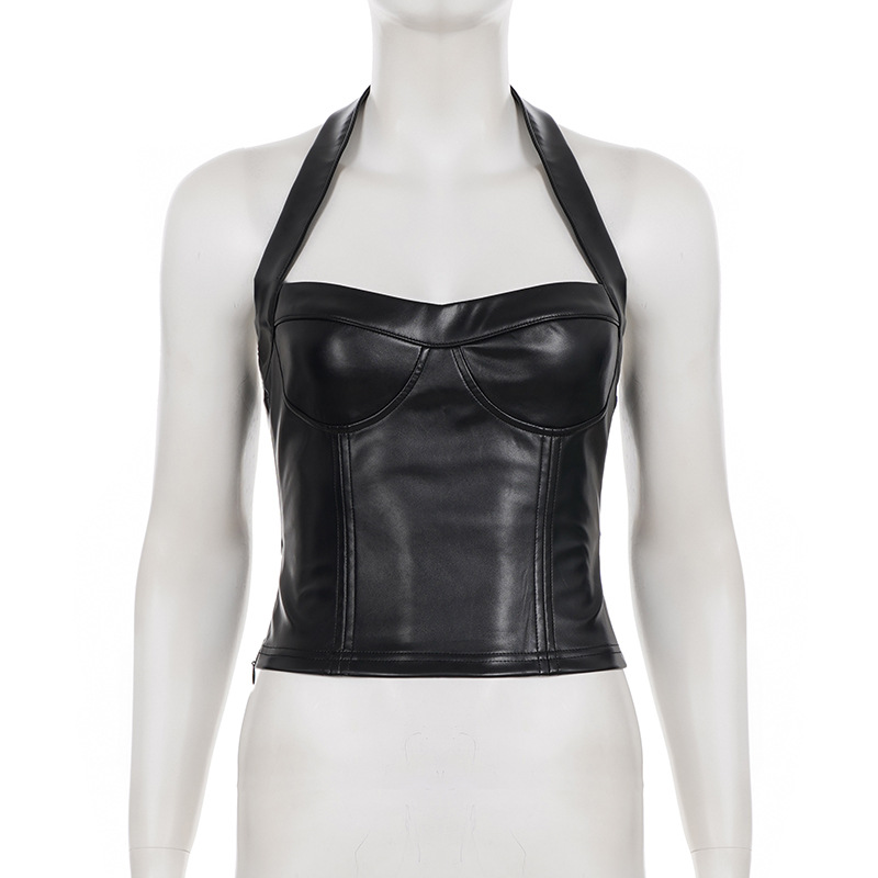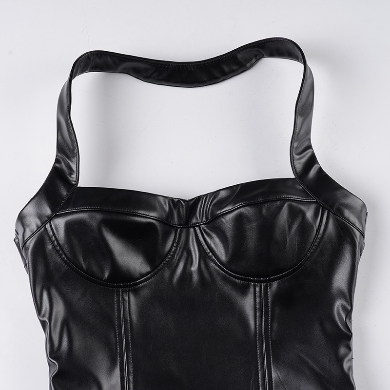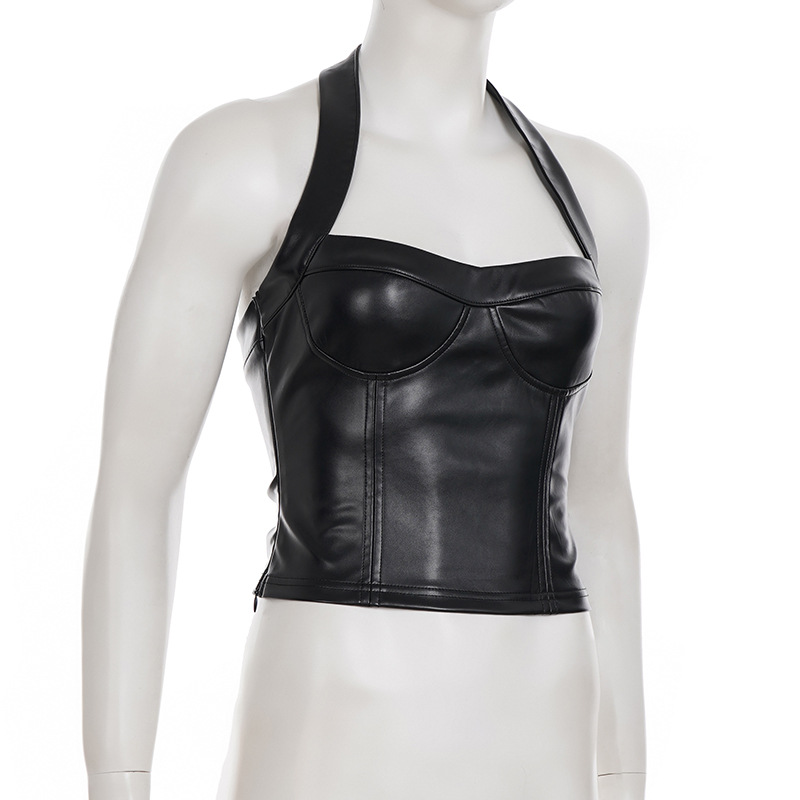 Copy| Product Name | Women Sexy Pu-Leather Solid Basics Halter Neck Top |
