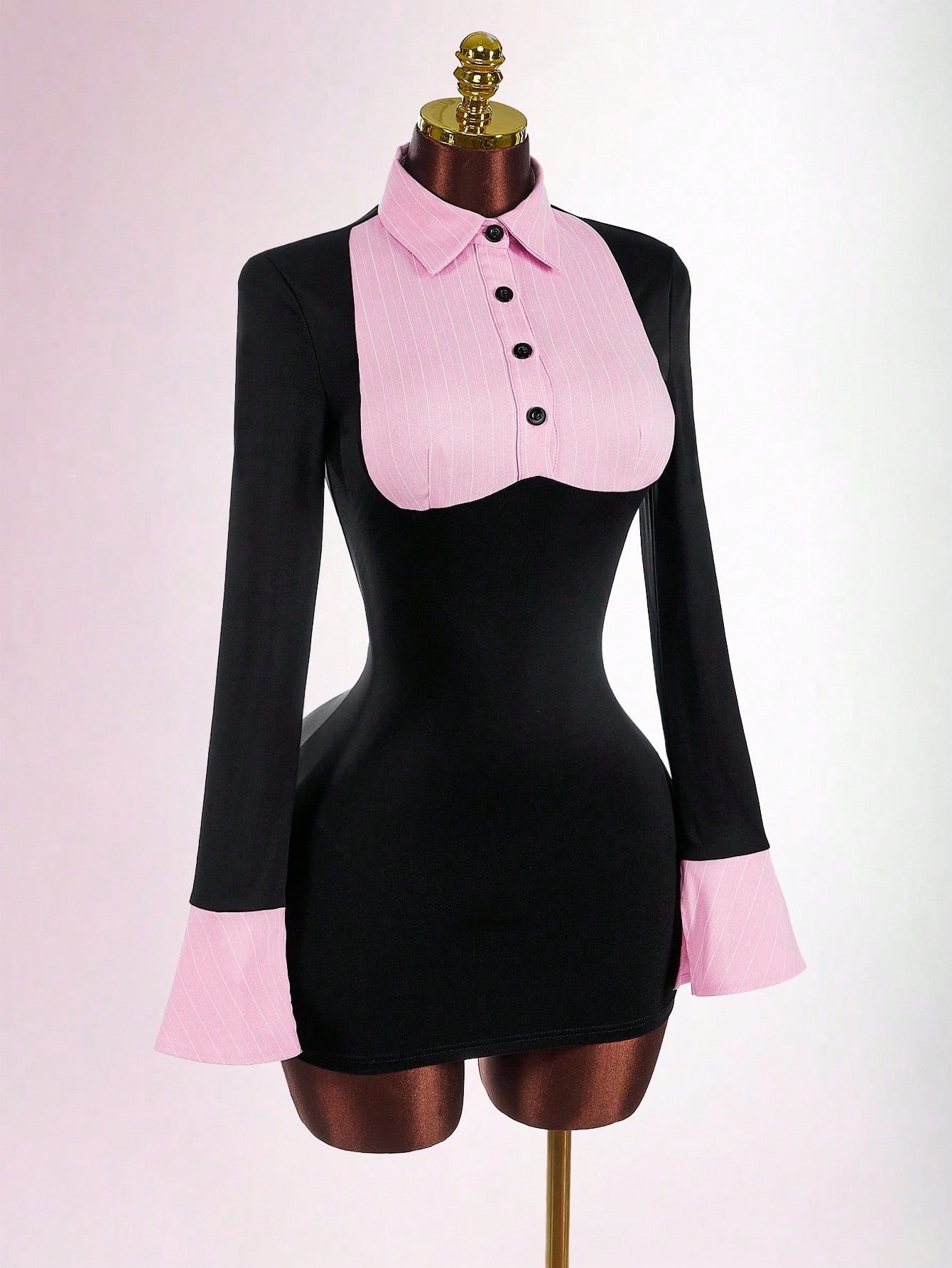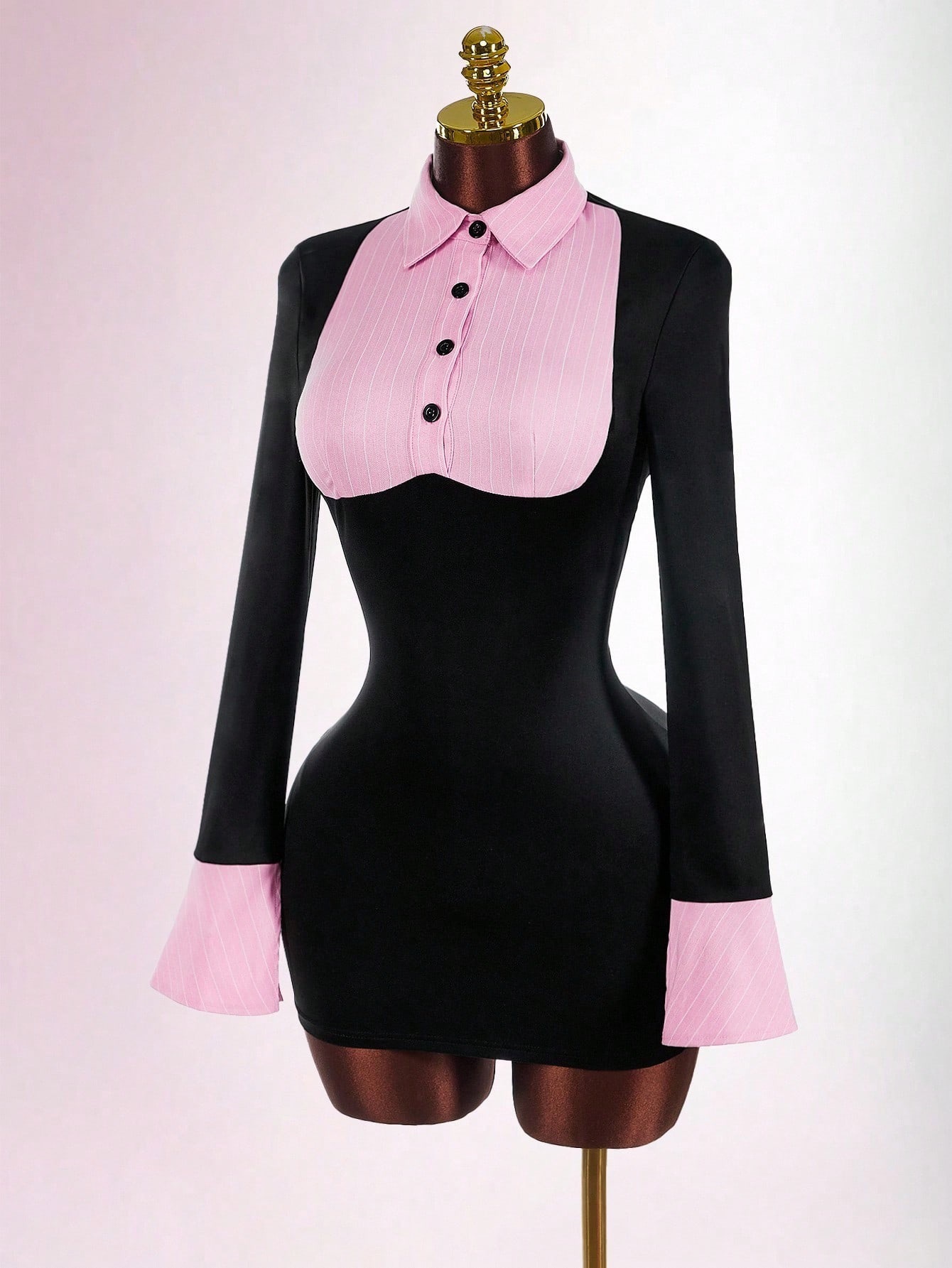 Copy| Product Name | Women Sexy Turndown Collar Faux Two-Piece Color Block Bodycon Dress |
