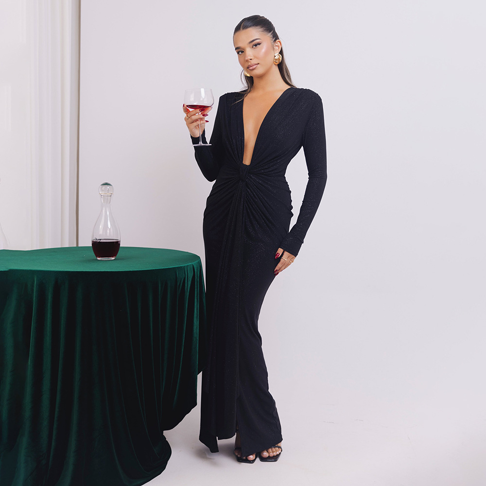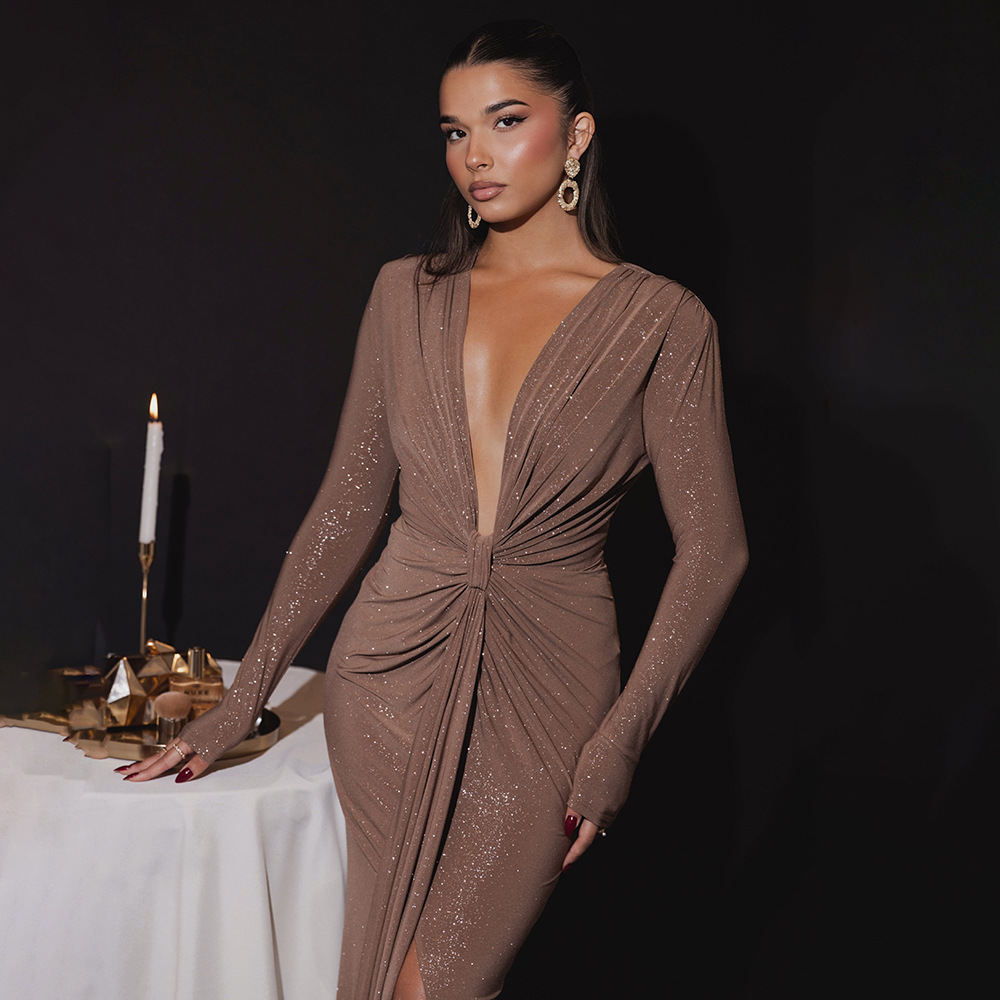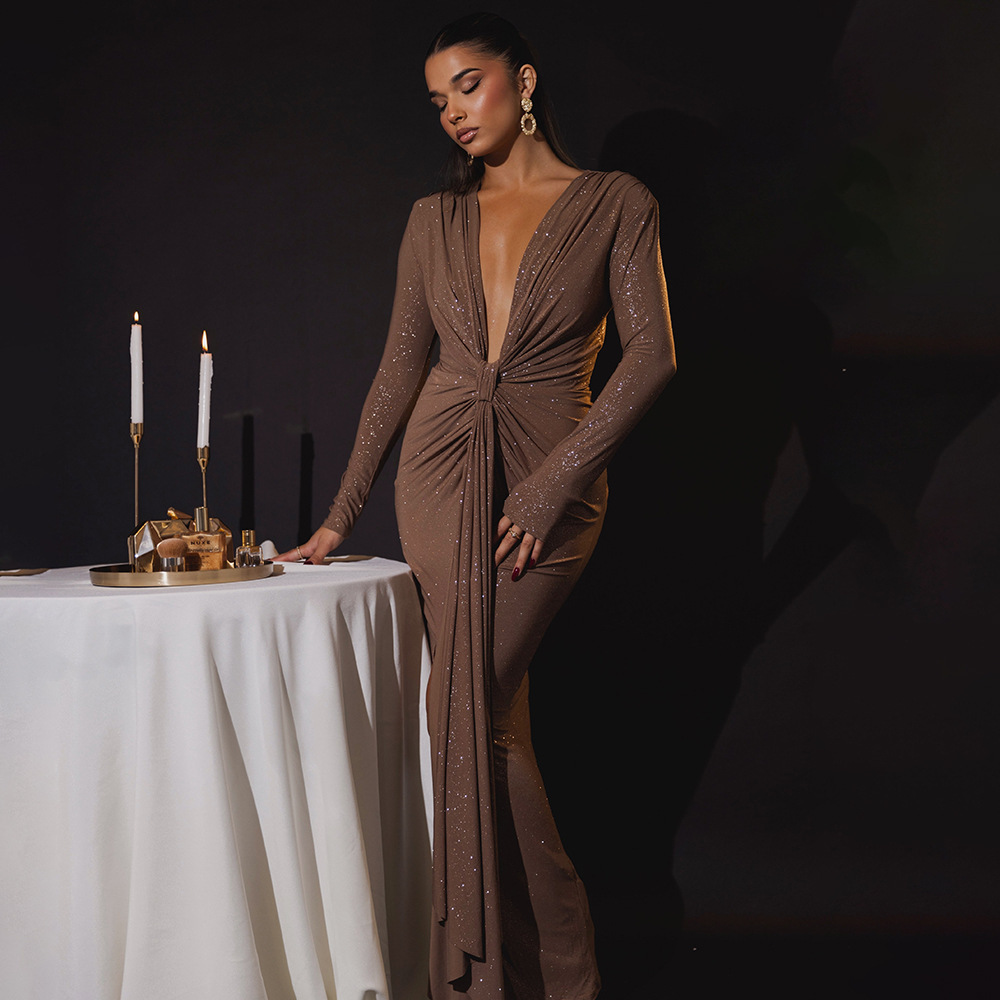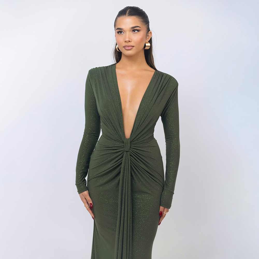 This Women Sexy v-Neck Gathered Lace-Up Long-Sleeved Bodycon Maxi Dress Design Made Of Good Quality Polyster And Spandex Material, Which Is Stretchy, Durable And Comfortable. The Long Evening Dresses And Gowns Is Always The Mainly Choice For All Kinds Of Parties, Cocktail, Prom, Events, And Dating Occasions. Evening Gowns At Global Lover Comes With Huge Selections - Sequins, Beaded, Satin, Velvet, Lace.... When You Need Wholesale Evening Dresses, Global Lover Wholesale Women Garment Online Shop Is Your One-Stop Online Shopping Choice.