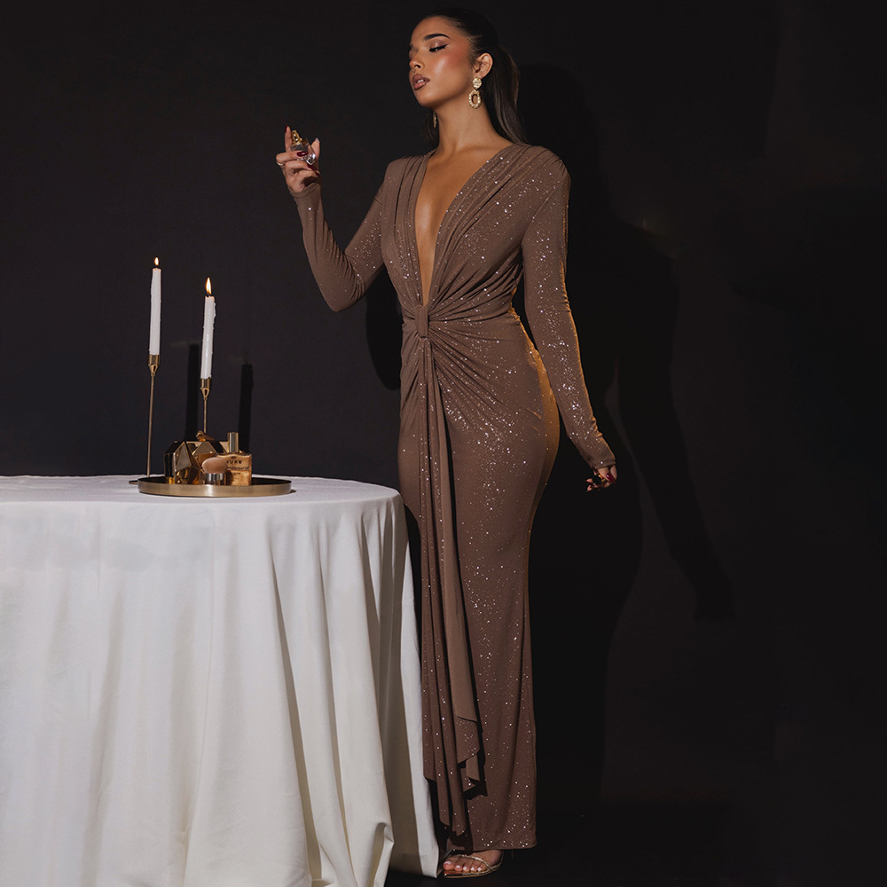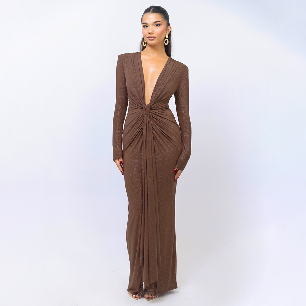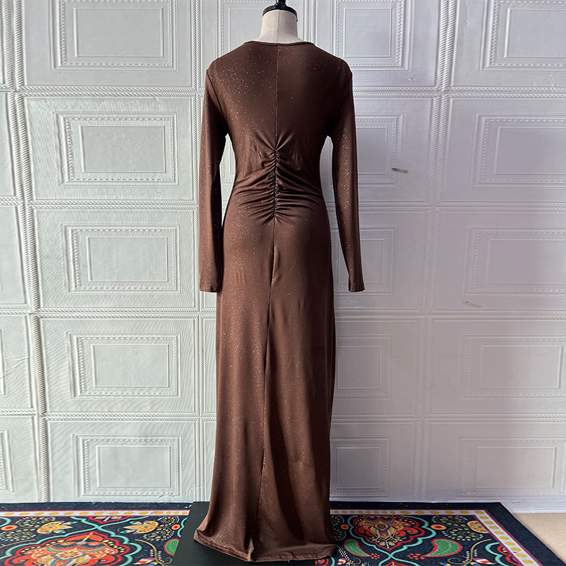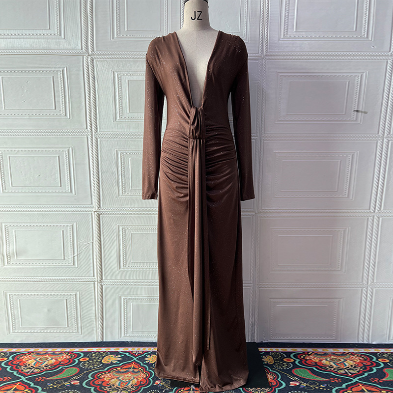 Copy| Product Name | Women Sexy V-Neck Gathered Lace-Up Long-Sleeved Bodycon Maxi Dress |
