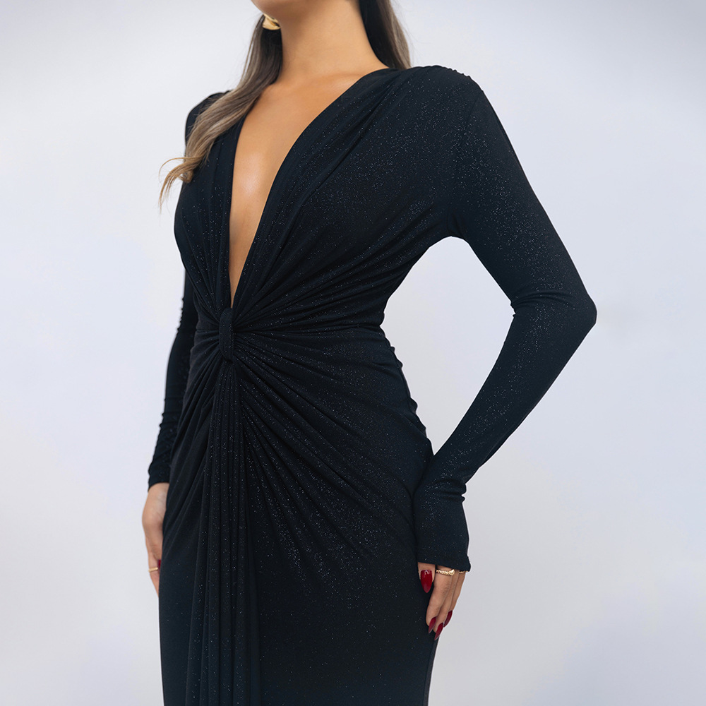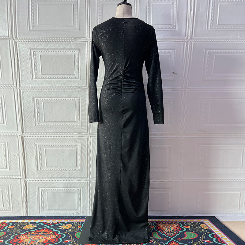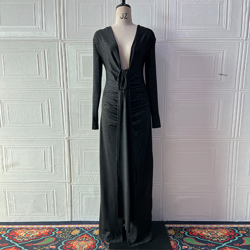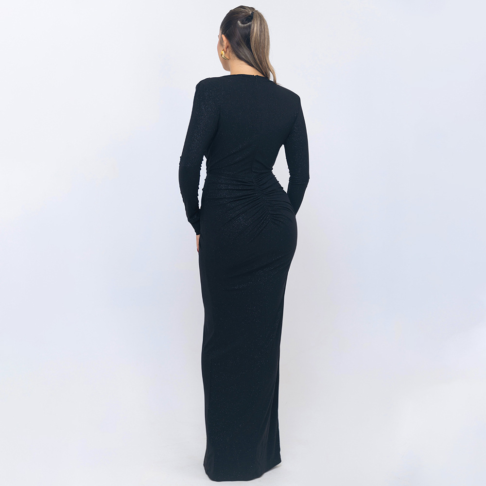 Copy| Product Name | Women Sexy V-Neck Gathered Lace-Up Long-Sleeved Bodycon Maxi Dress |