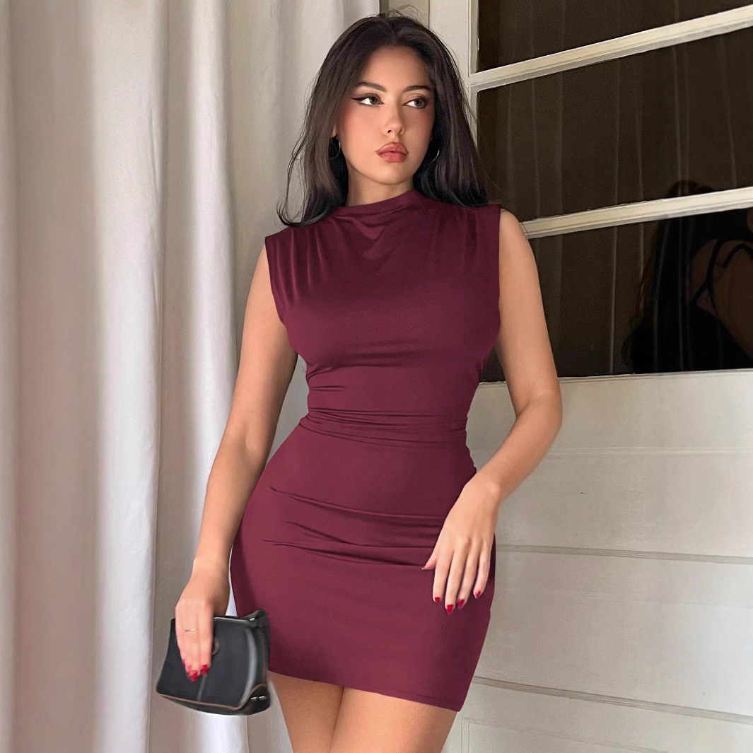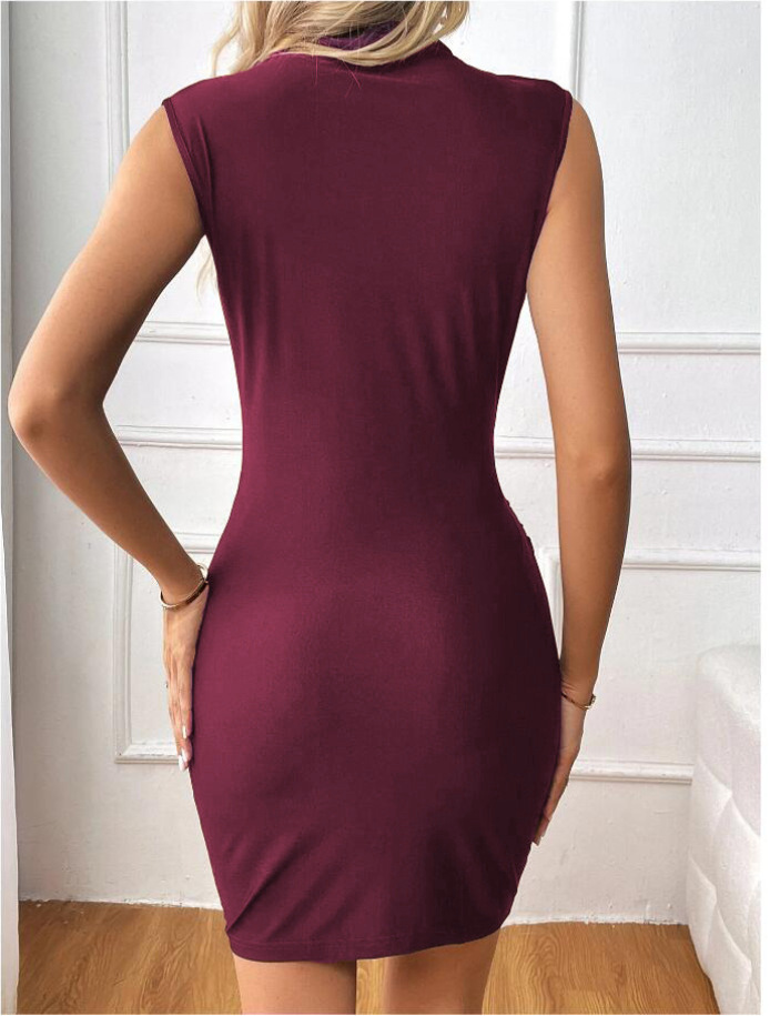 Copy| Product Name | Women Sleeveless High-Neck Pleated Bodycon Dress Sexy Mini Dress |