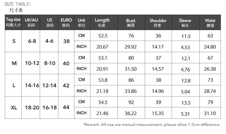 High Elasticity Fabric:Please add 0-0.5 CM from the garment size to body size.