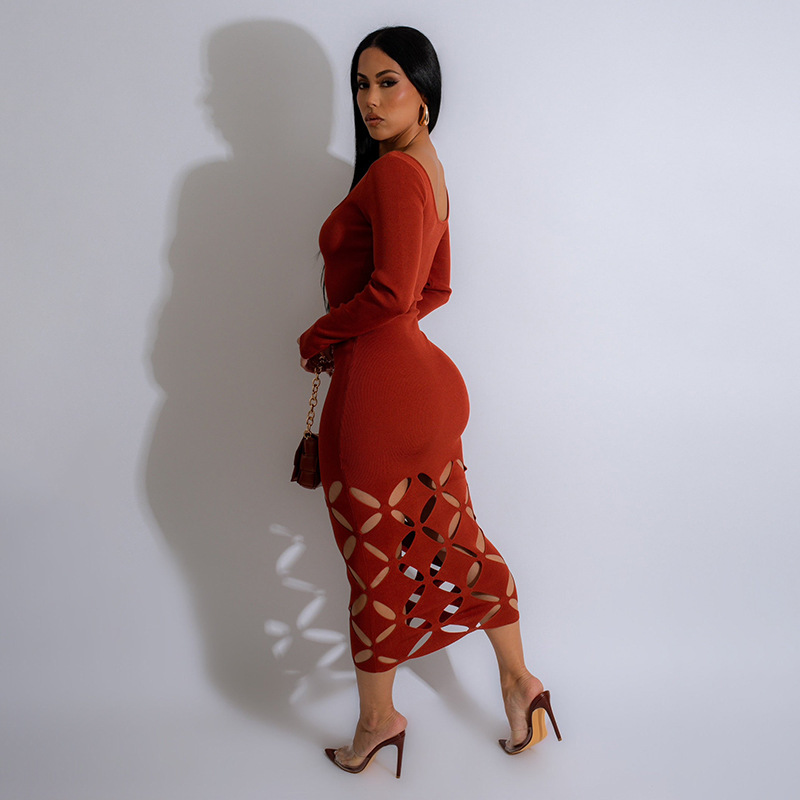 Copy| Product Name | Women Spring Solid Round Neck Long-sleeved Sexy Hollow-out Bodycon Dress |