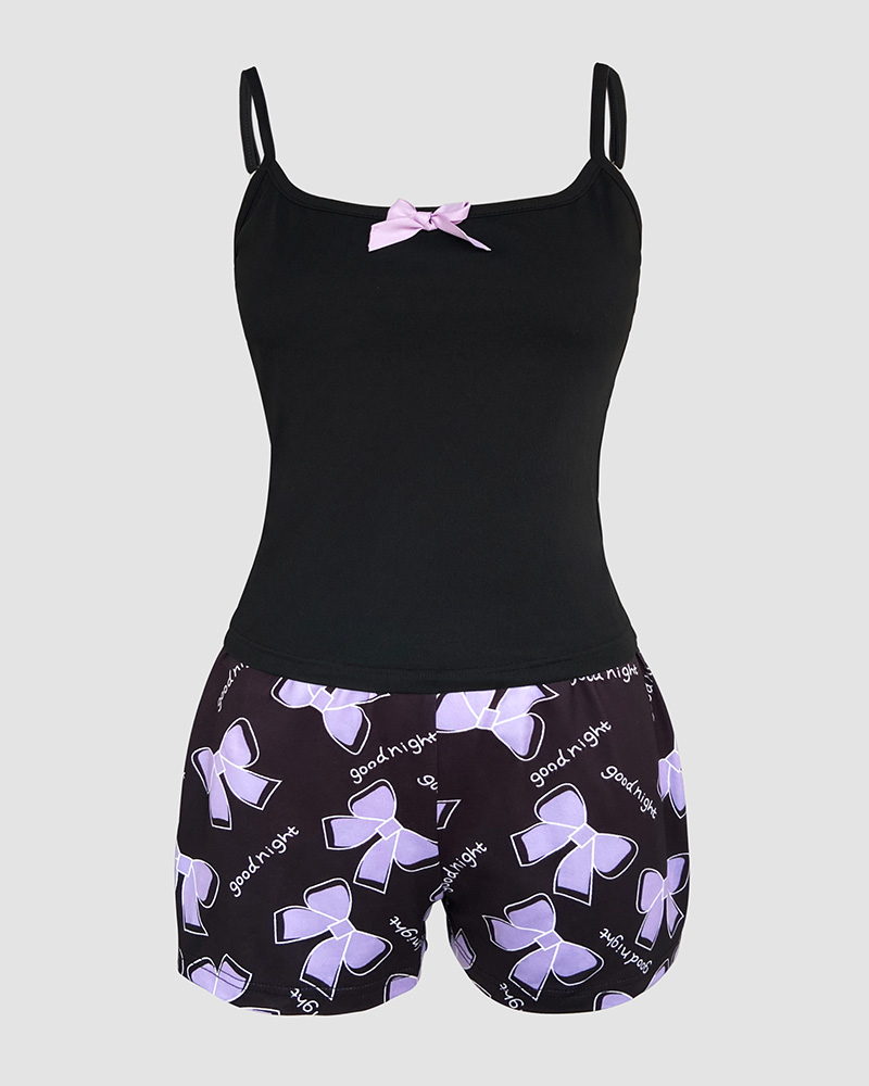 Copy| Product Name | Women Strappy Solid Bow Top and Printed Shorts Two-Piece Set |