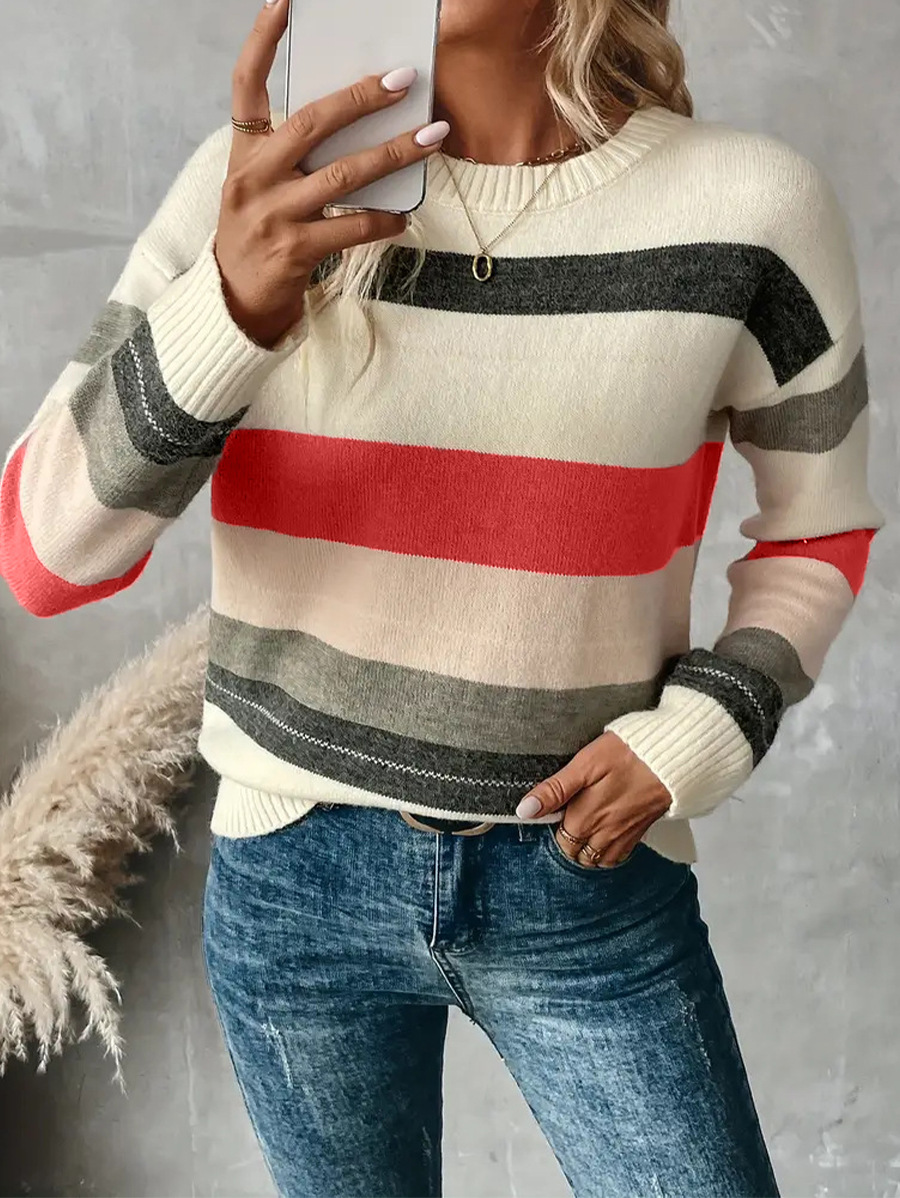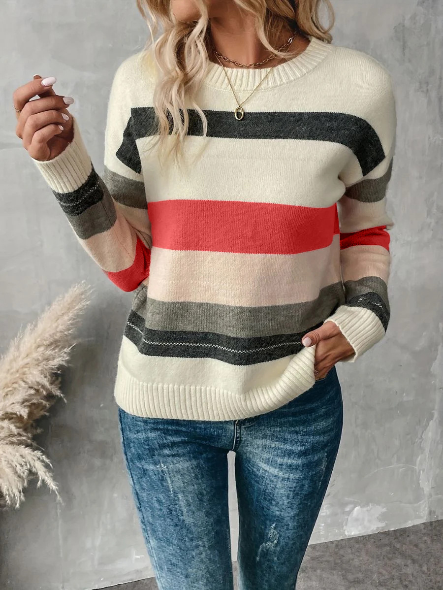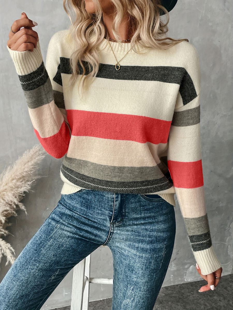 Copy| Product Name | Women Striped Color Block Patchwork Knitting Round Neck Sweater |