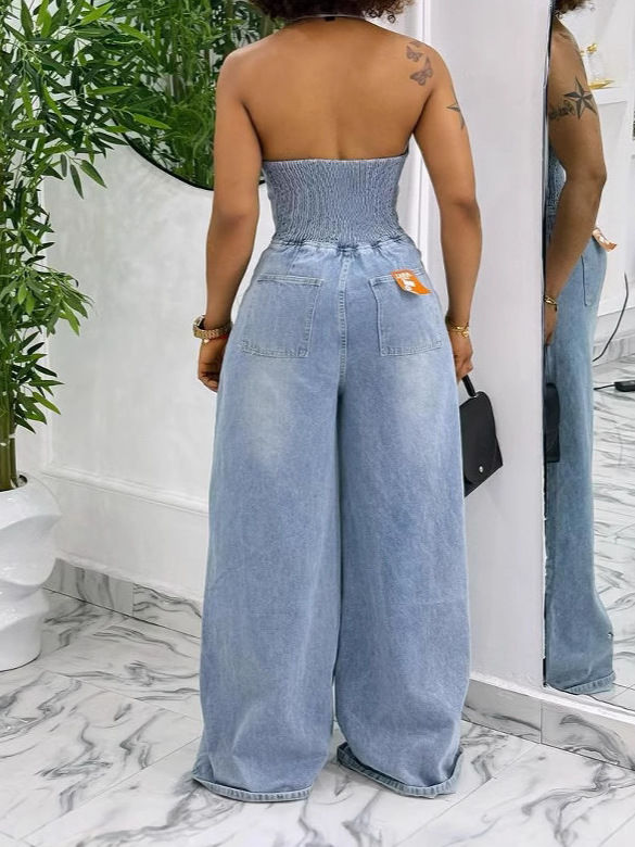 Copy| Product Name | Women Turndown Collar Halter Neck Backless Denim Wide-Leg Jumpsuits |