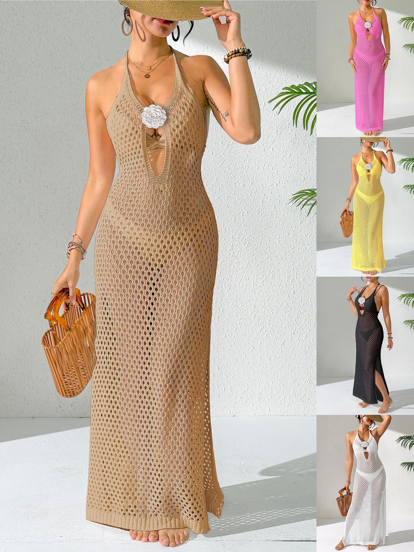 Copy| Product Name | Women V-neck Backless Halter Neck Lace-up Hand Hollowed-out Side Slit Bodycon Beach Dress |