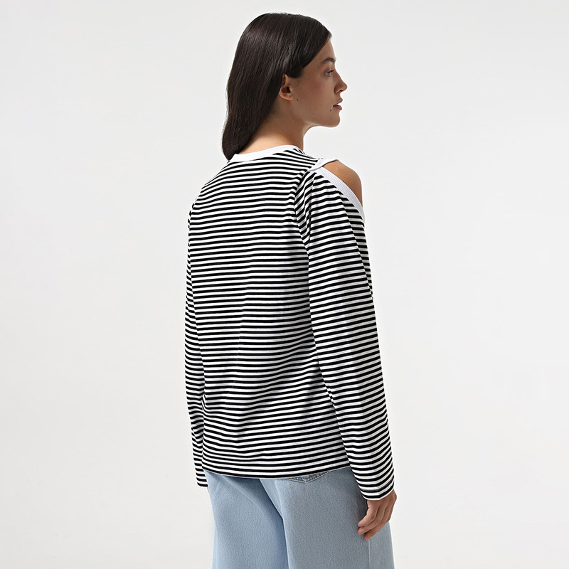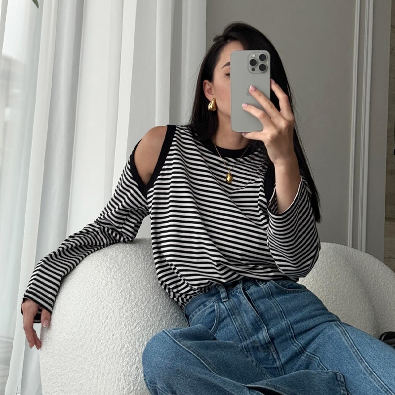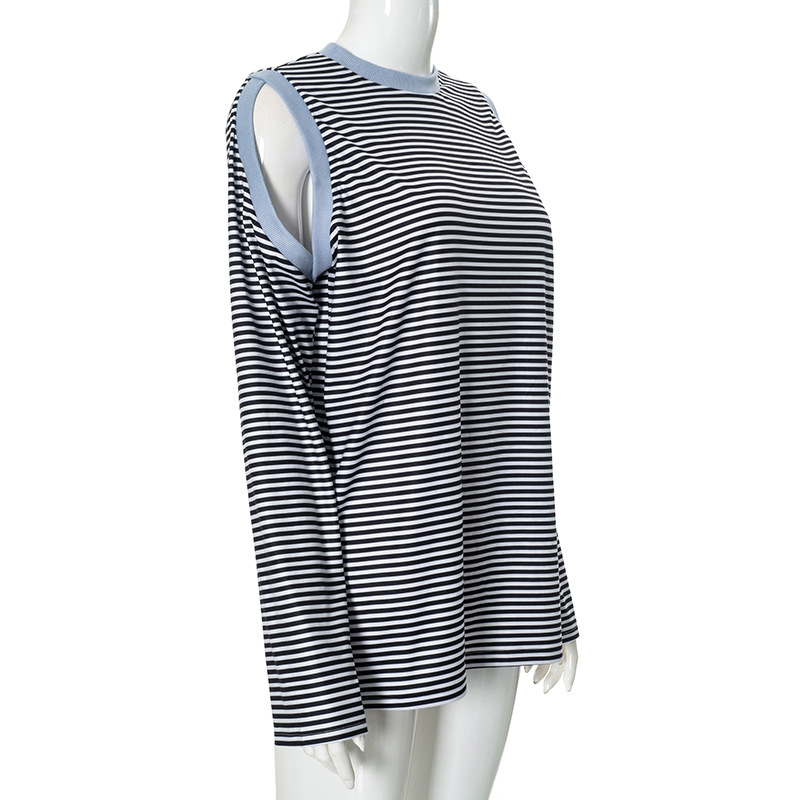 Copy| Product Name | Women autumn Casual stripe Round Neck off-shoulder long-sleeved contrast color loose Top |