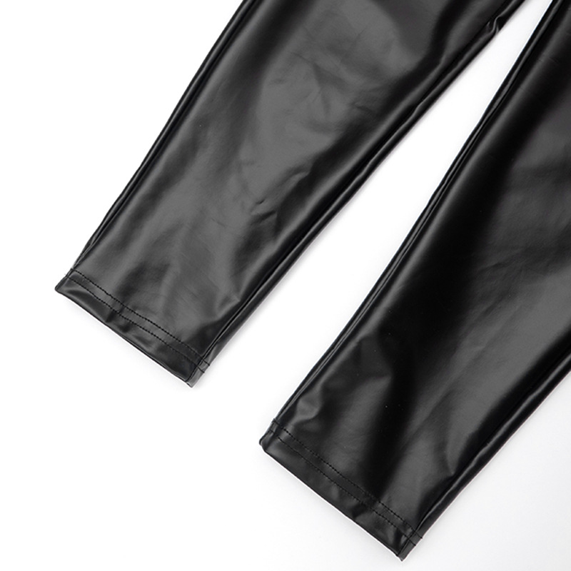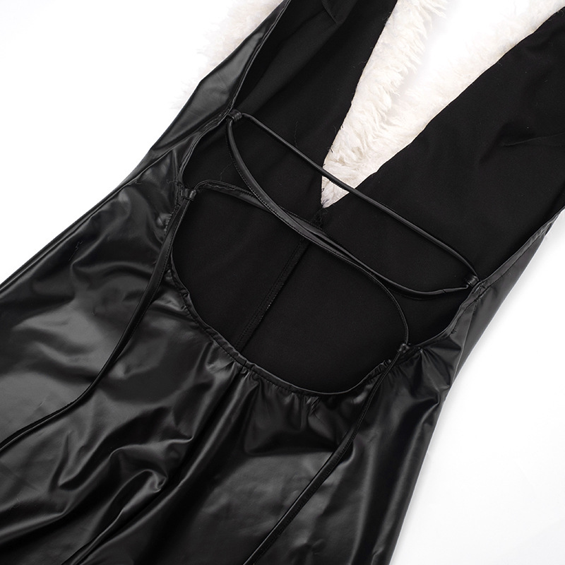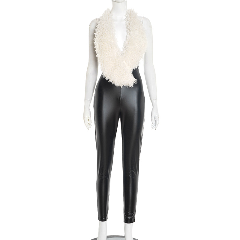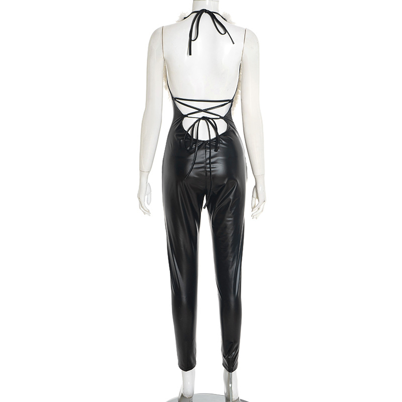 Copy| Product Name | Women's Autumn Halter Neck Furry Collar Lace-Up Patchwork Leather Low Back Hollow Out Jumpsuit |