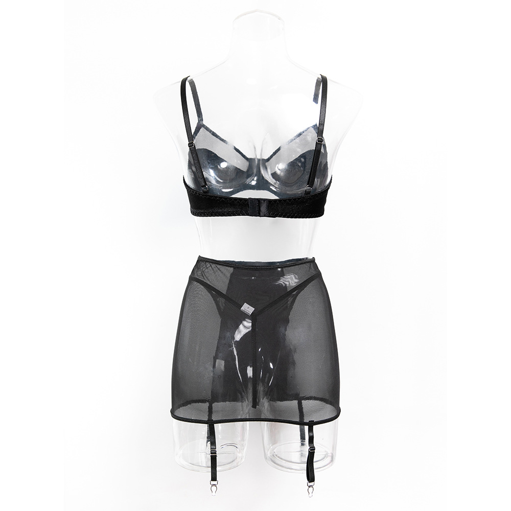 Copy| Product Name | Women's Black See-Through Mesh Bra High-Waist Butt Lift Three-Piece Lingerie Set |