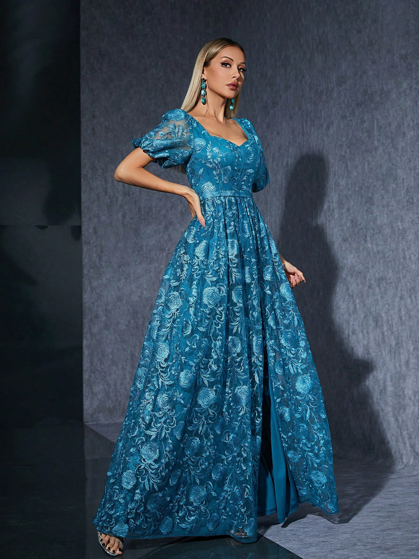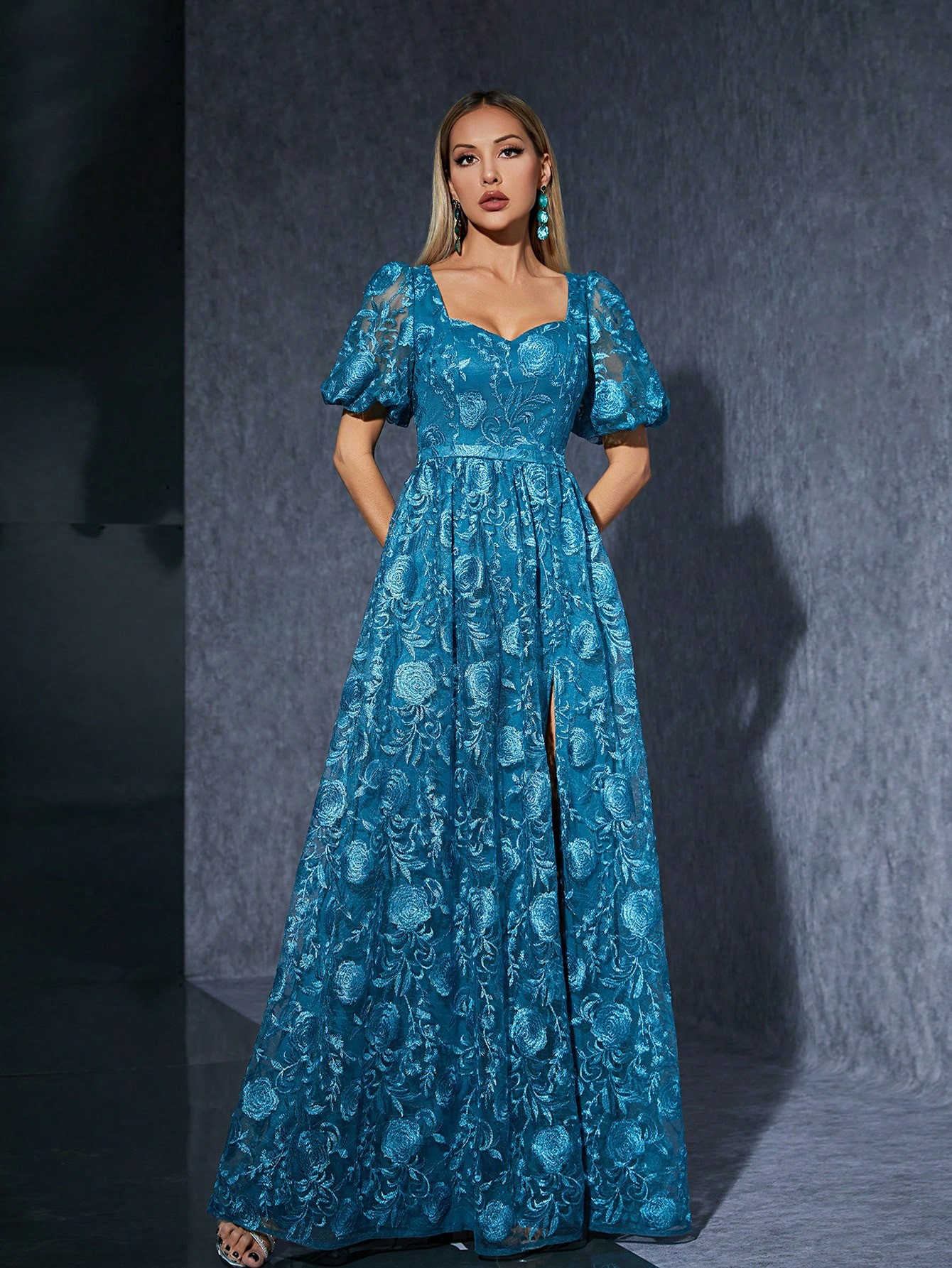 Copy| Product Name | Women's Blue Puff Sleeve Sweet Formal Party Slit Evening Dress |