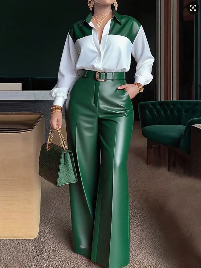 Copy| Product Name | Women's Chic Career Long Sleeve Shirt & Belted Wide-Leg Leather Pants Set |