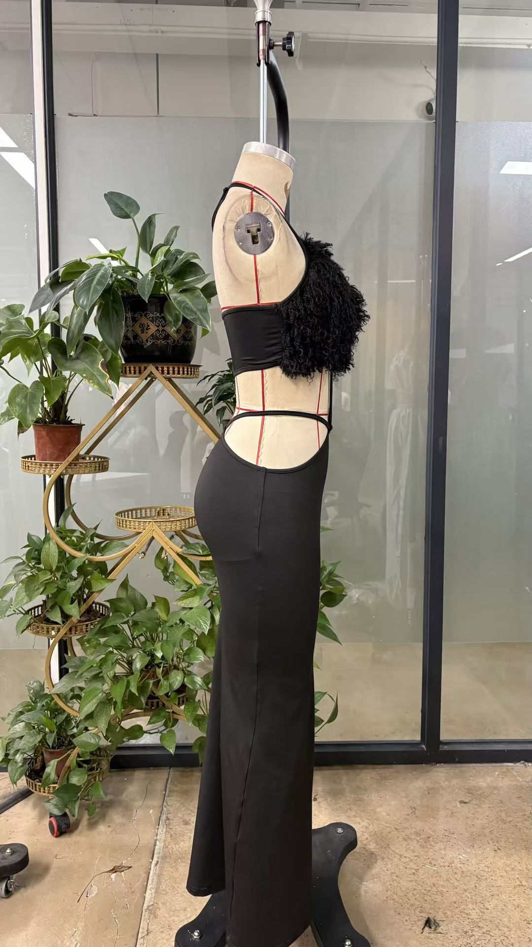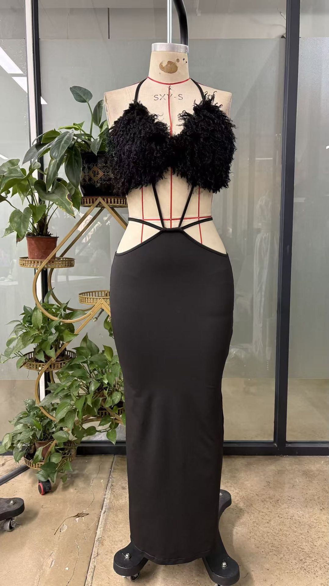 Copy| Product Name | Women's Chic Furry Patchwork Deep V Halter Neck Slim Waist Bodycon Dress |