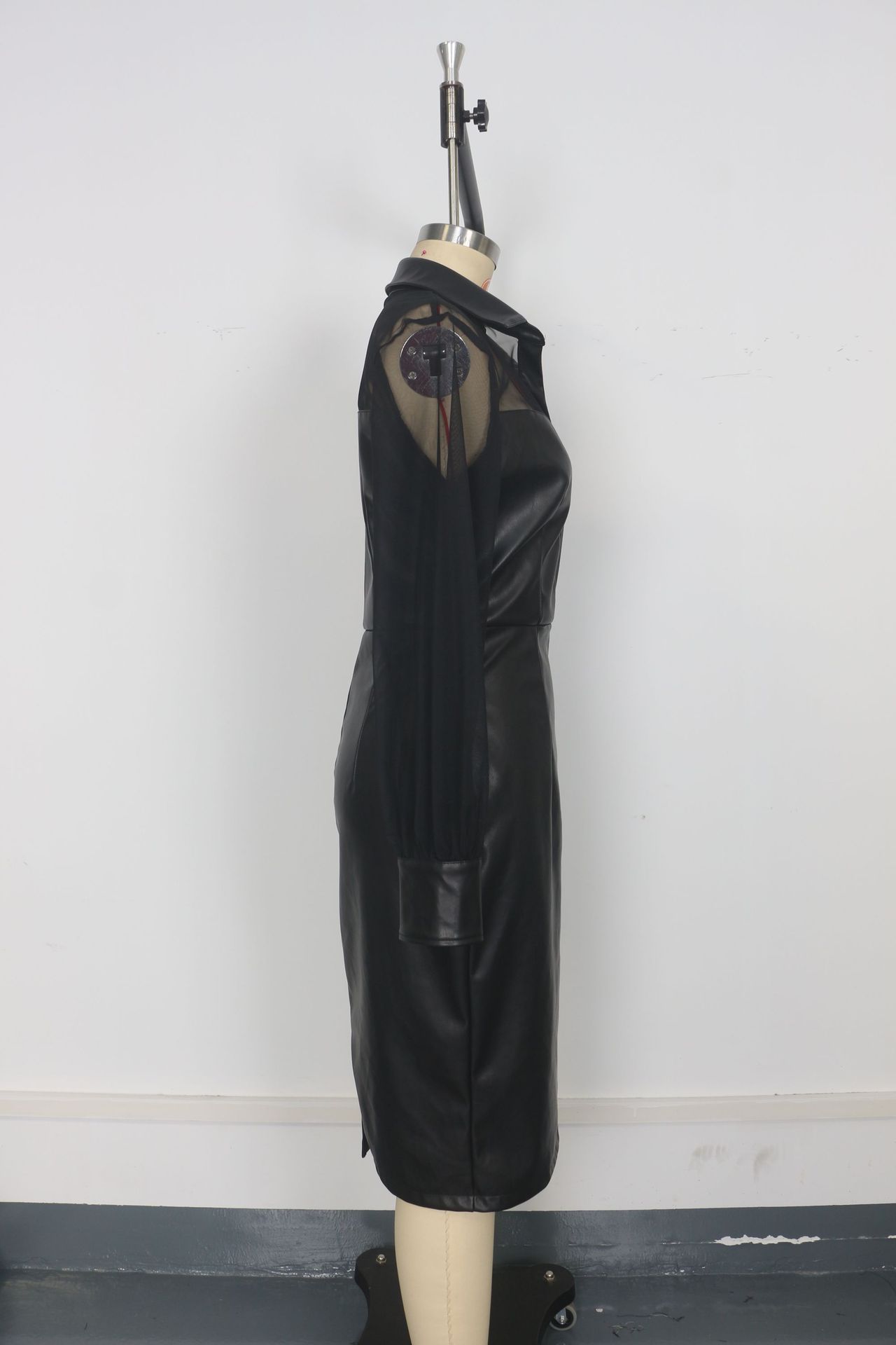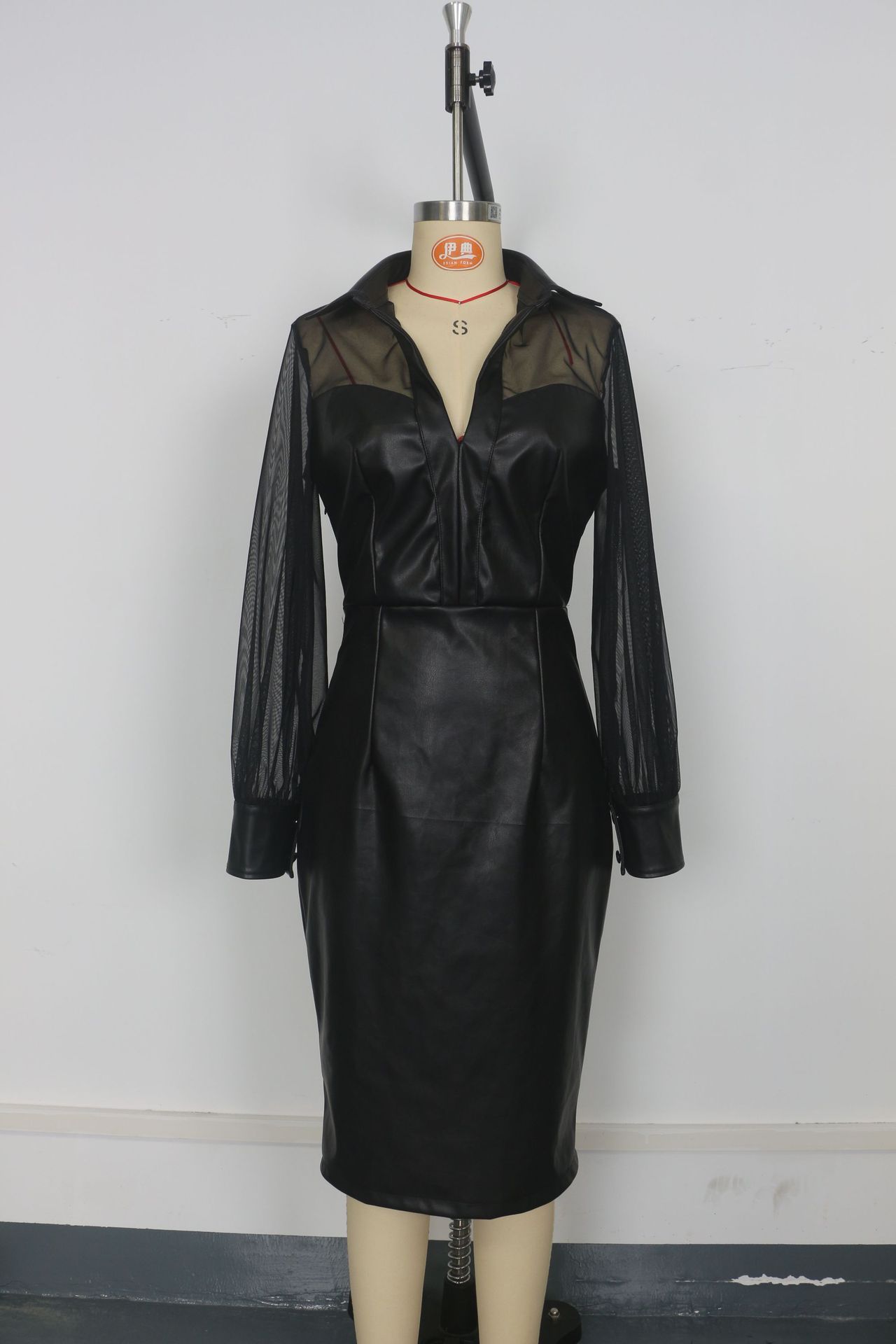 Copy| Product Name | Women's Clubwear Mesh PU Leather Patchwork V-Neck Bodycon Dress |