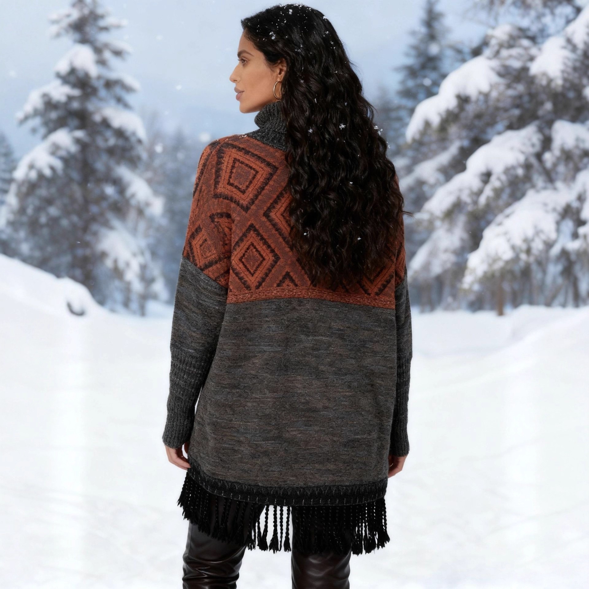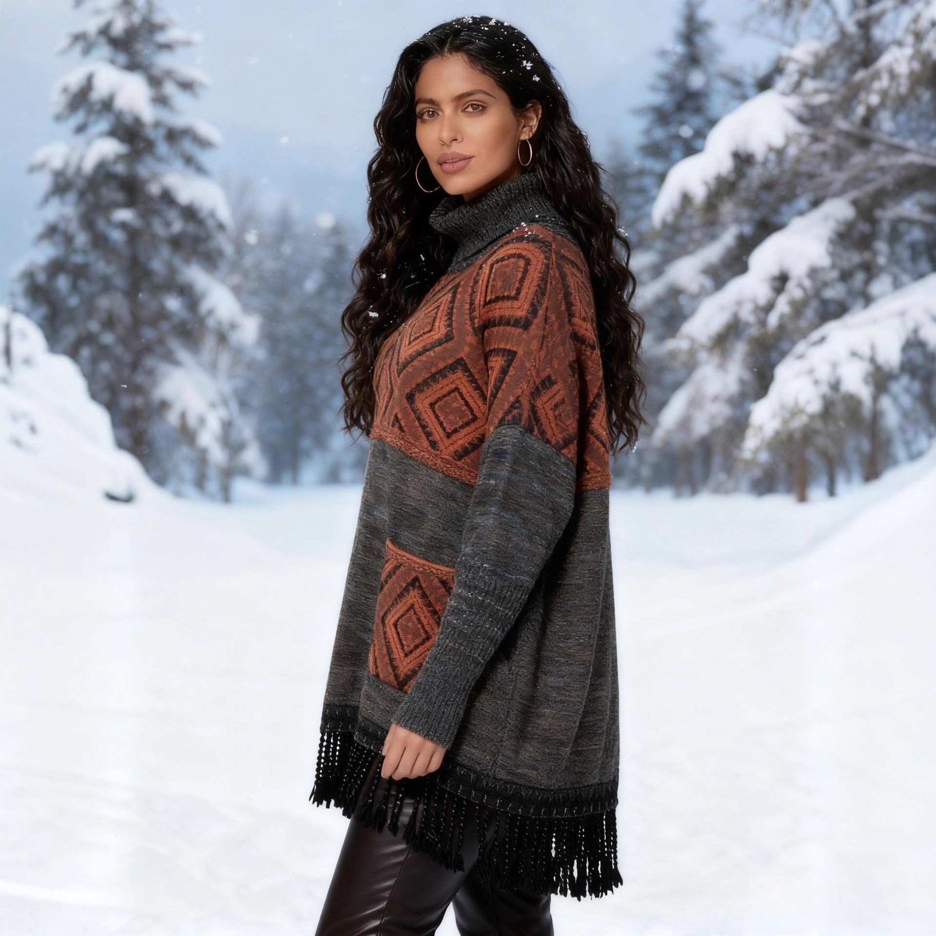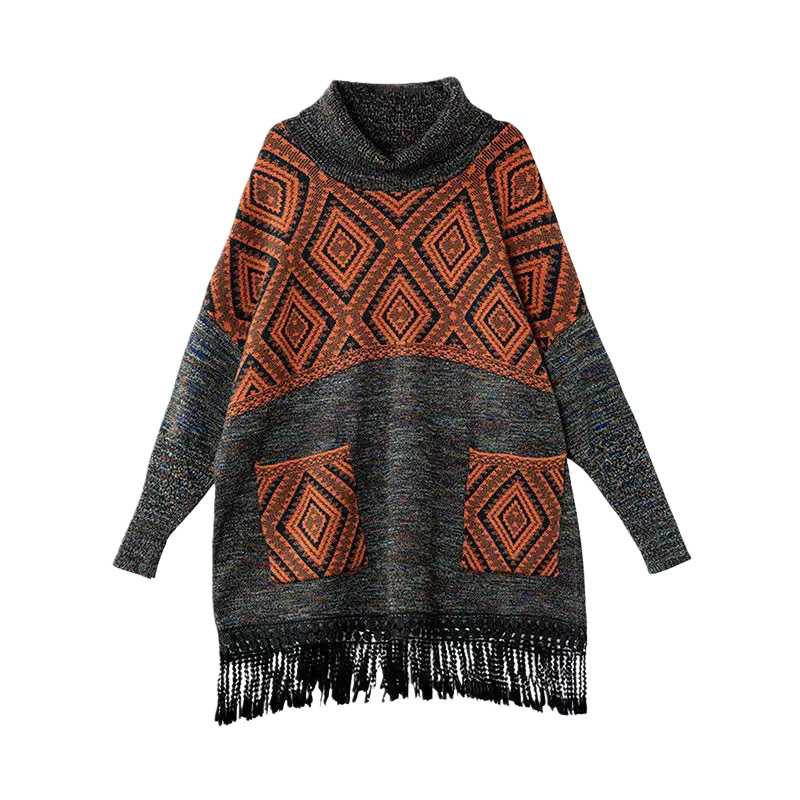 | Product Name | Women's Diamond Pattern High Neck Fringe Loose Knit Top |
