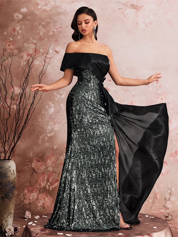 Copy| Product Name | Women's Elegant Sequin Patchwork Strapless Off-Shoulder Evening Dress Bridesmaid Gown |