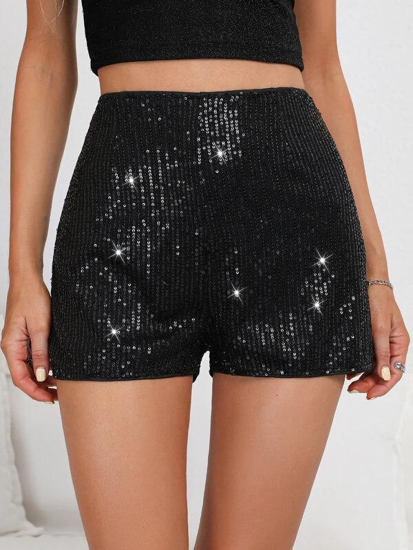 Copy| Product Name | Women's Fashion Glitter Sequin Slim Fit Solid Color Black Sexy Straight Leg Shorts |