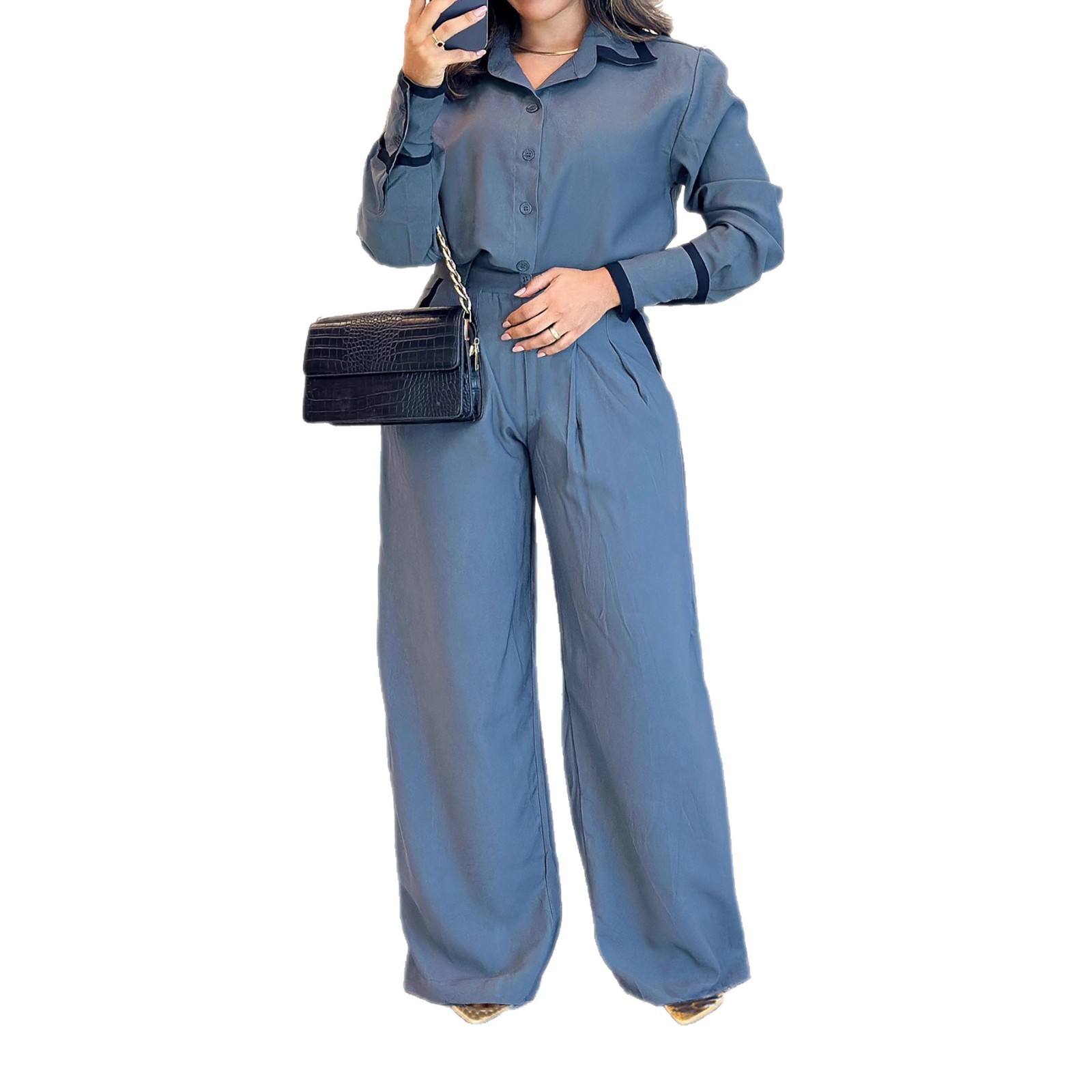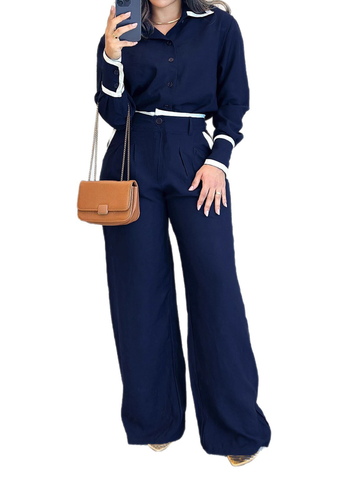 Copy| Product Name | Women's Fashion Patchwork Turndown Collar Long Sleeve Two-Piece Pants Set |