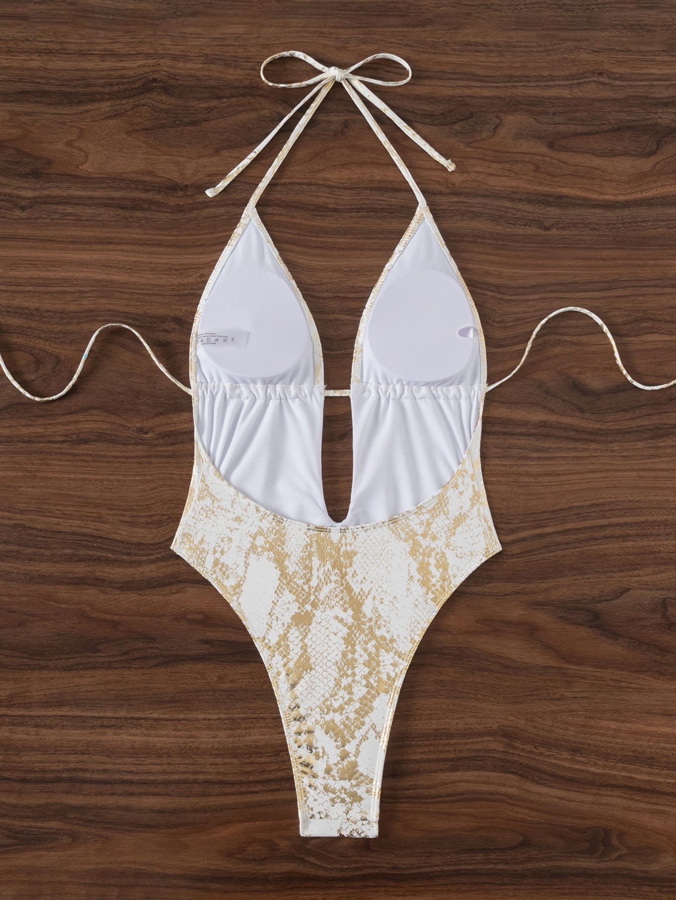Copy| Product Name | Women's Fashion Sexy One-Piece V-Neck Cut-Out Low Back Tie Detail Swimsuit |