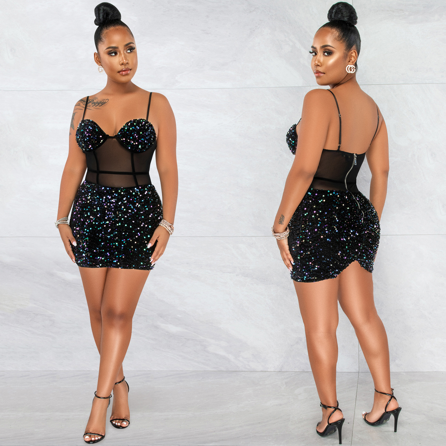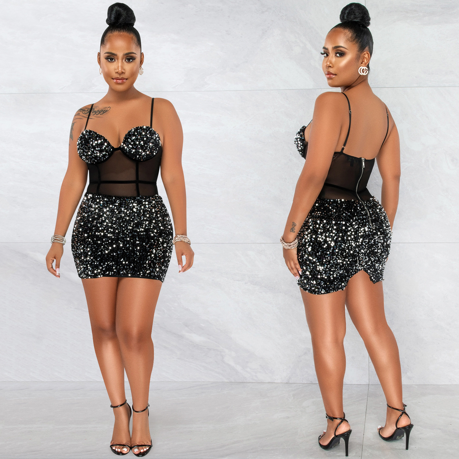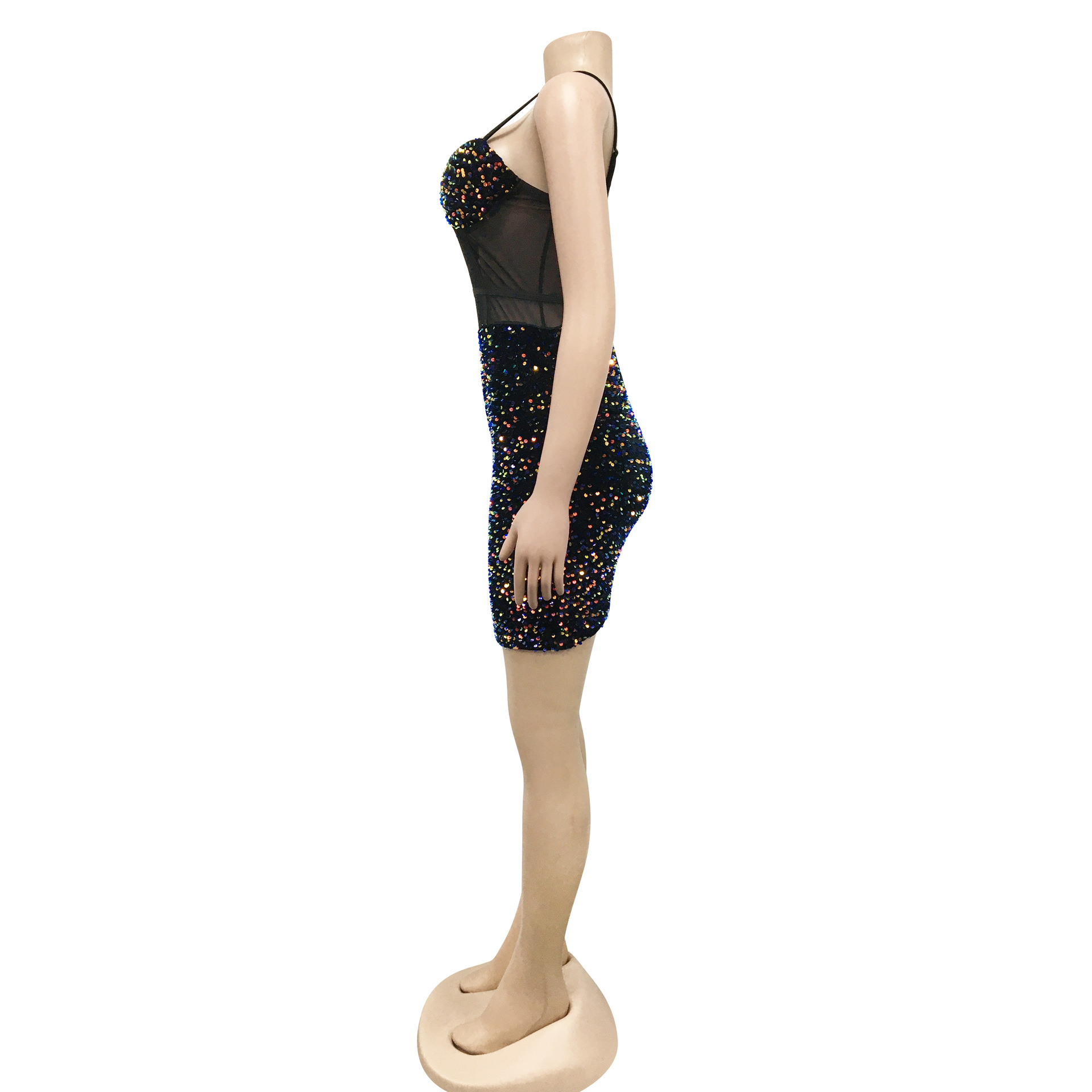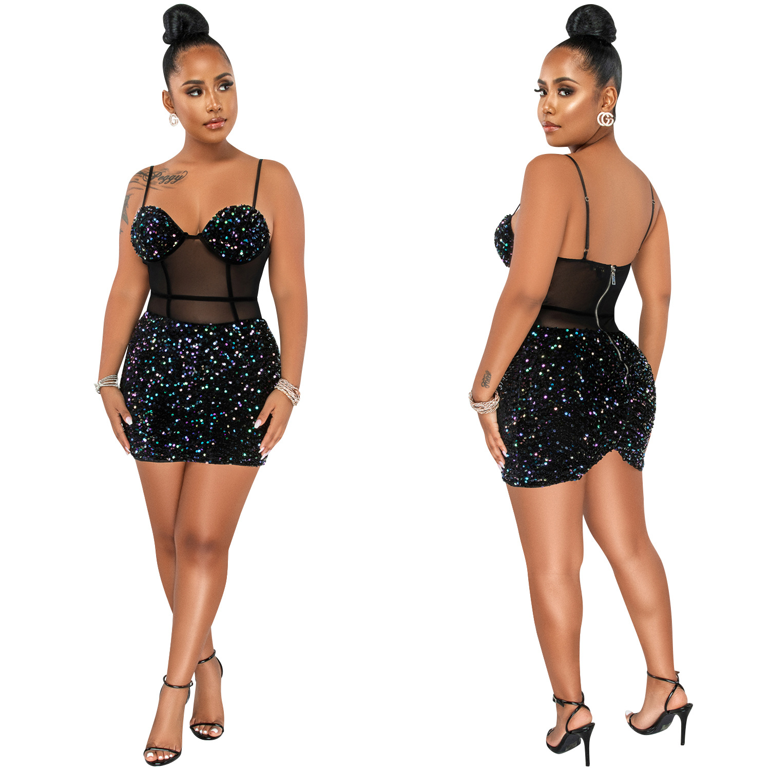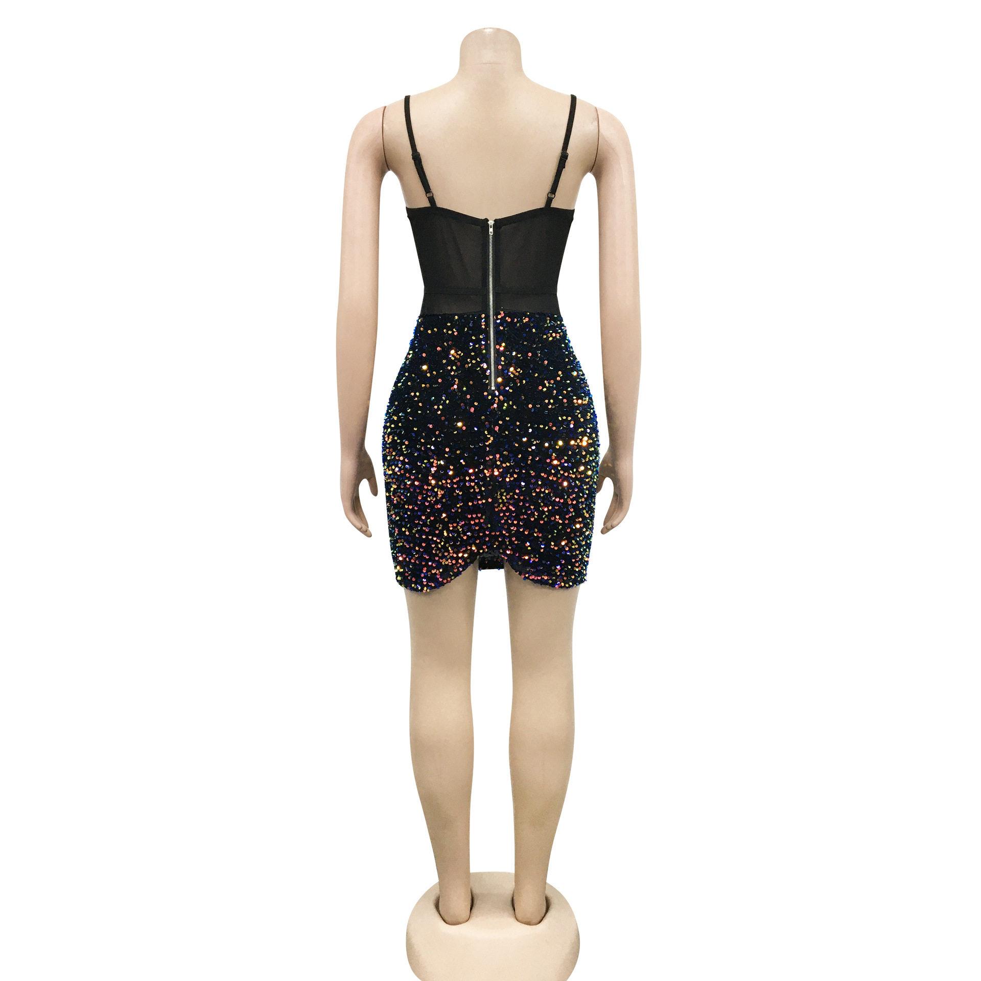 Copy| Product Name | Women's Fashion Sexy Strap Sequin Mesh See-Through Zipper Midi Dress |