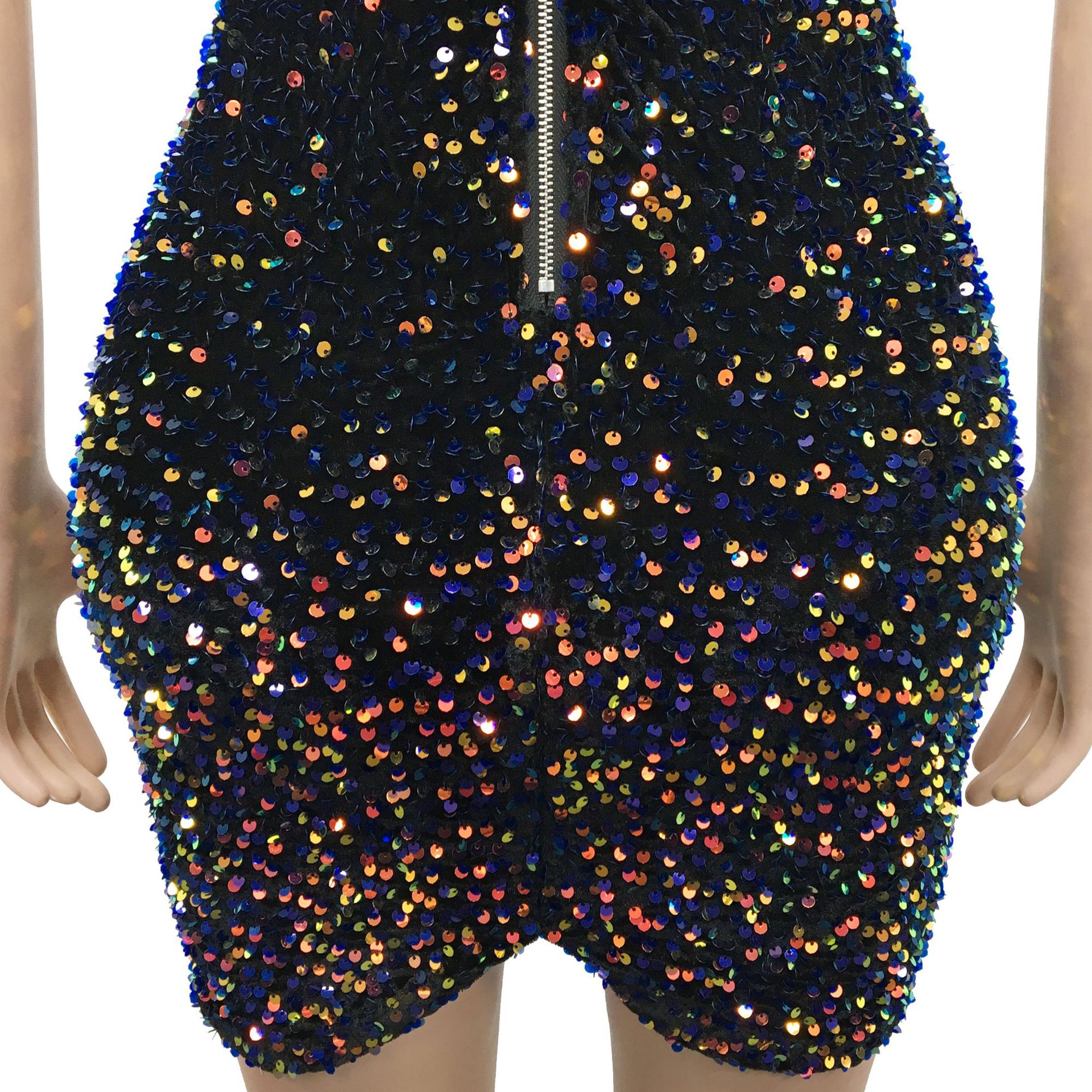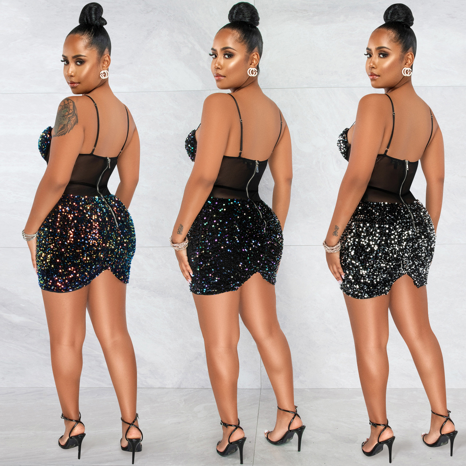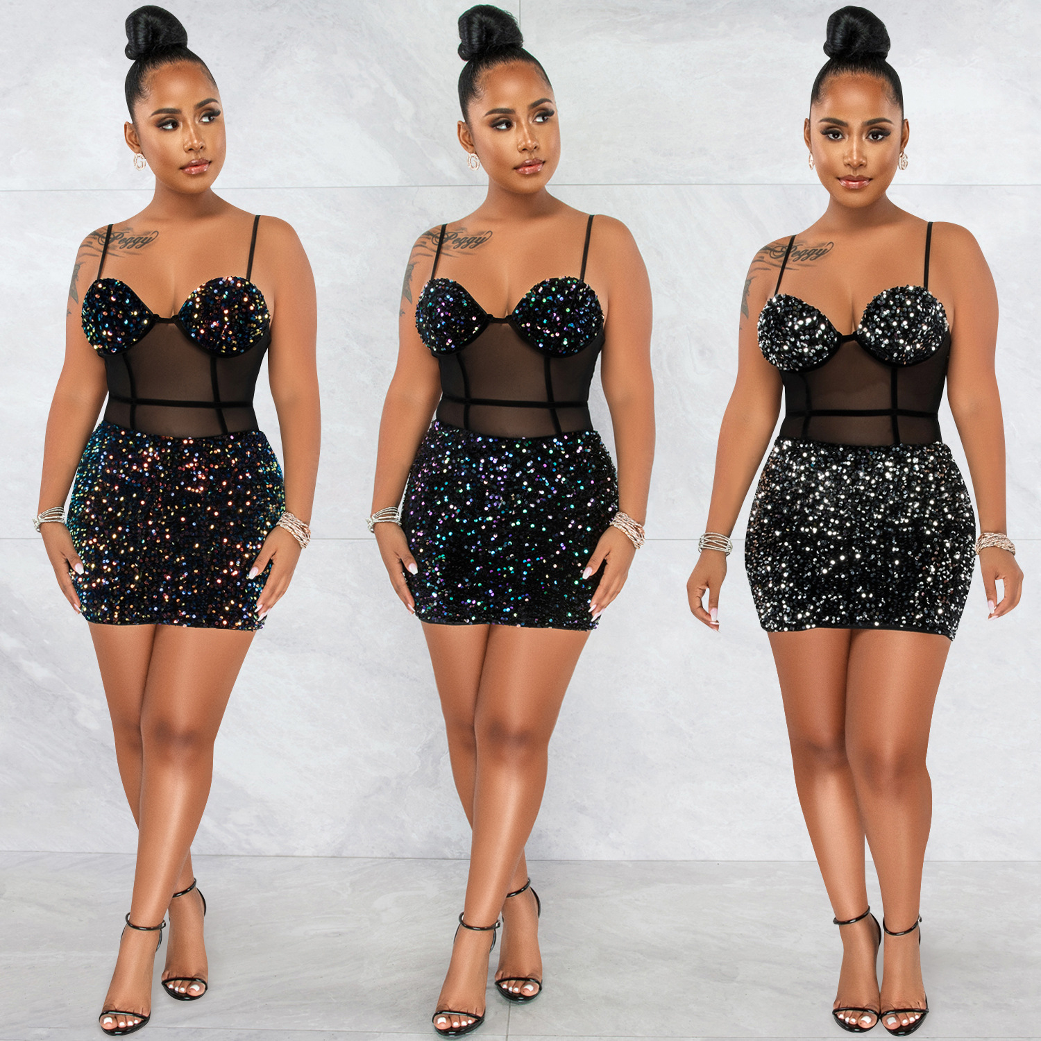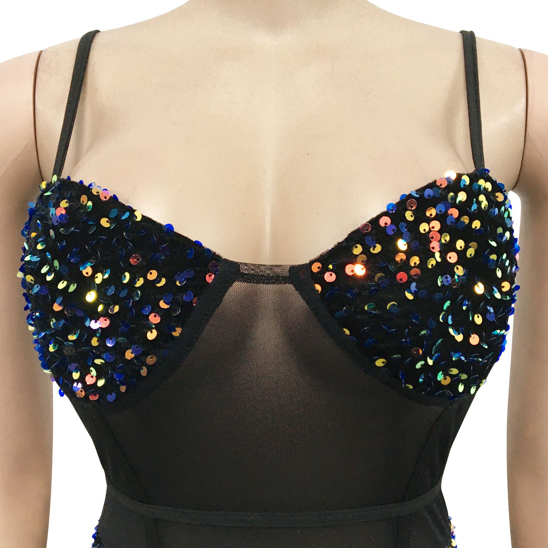 Copy| Product Name | Women's Fashion Sexy Strap Sequin Mesh See-Through Zipper Midi Dress |