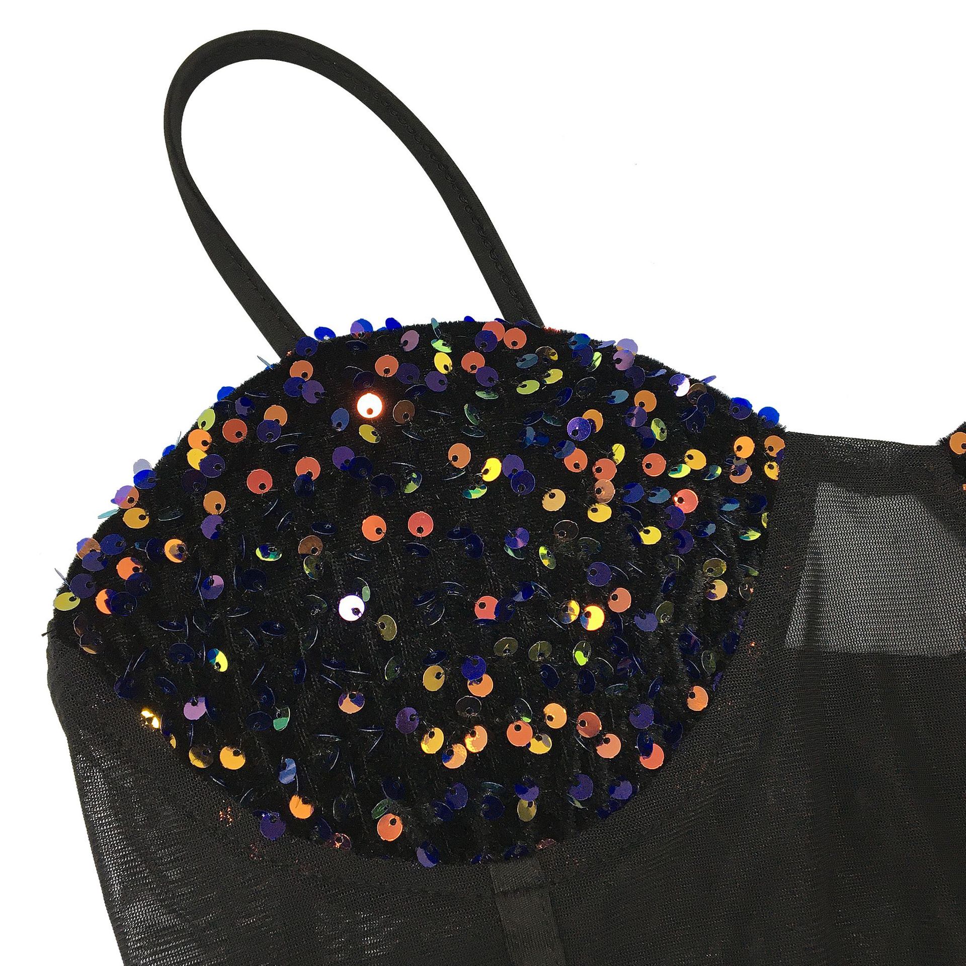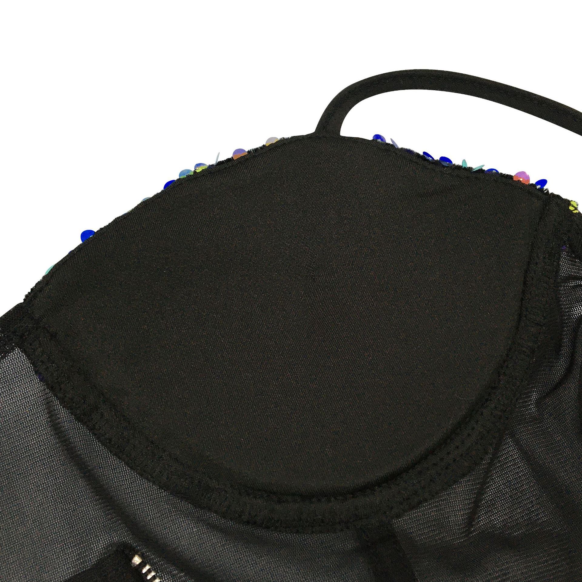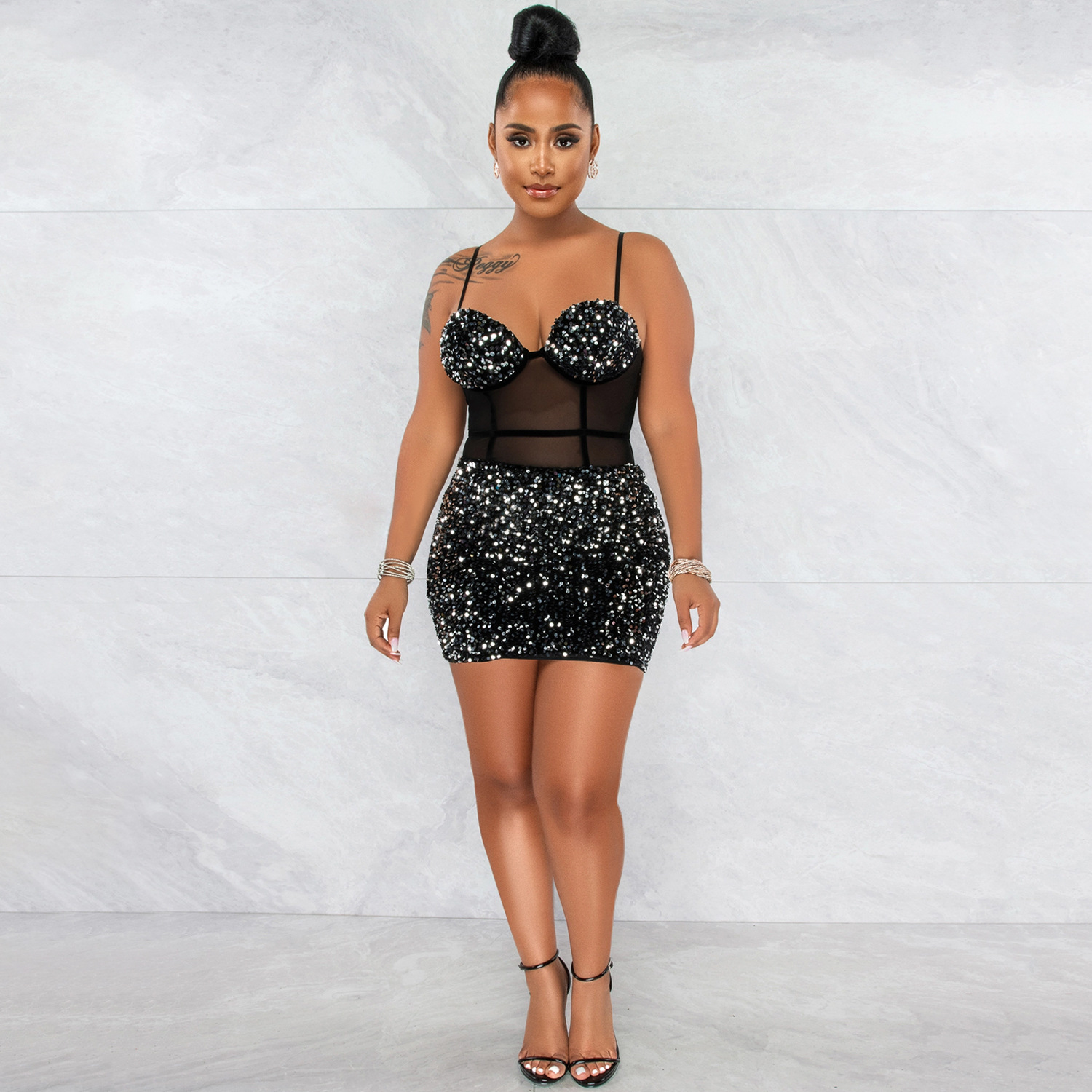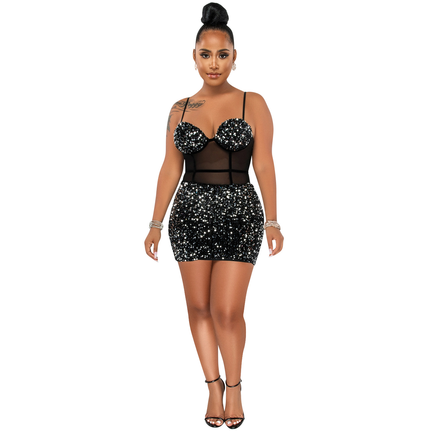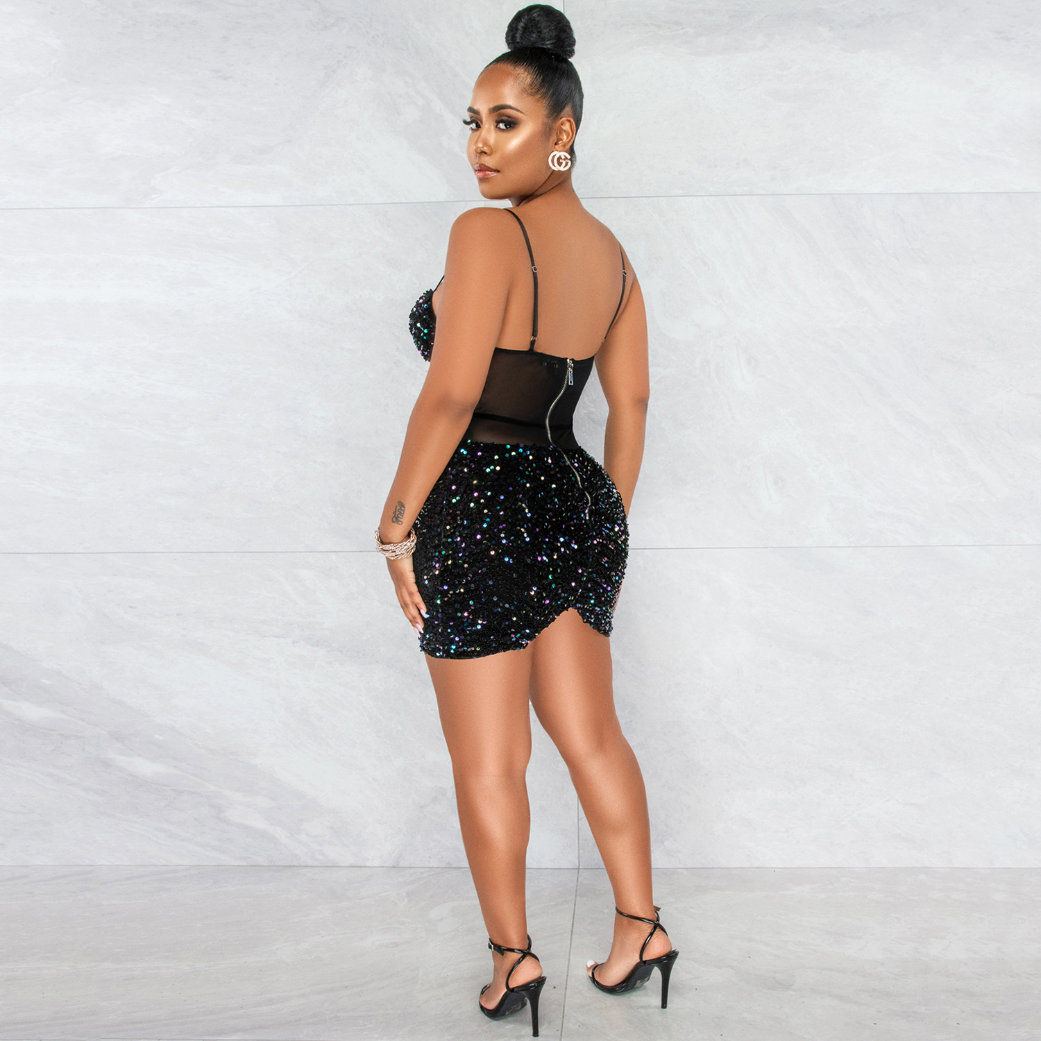 Copy| Product Name | Women's Fashion Sexy Strap Sequin Mesh See-Through Zipper Midi Dress |